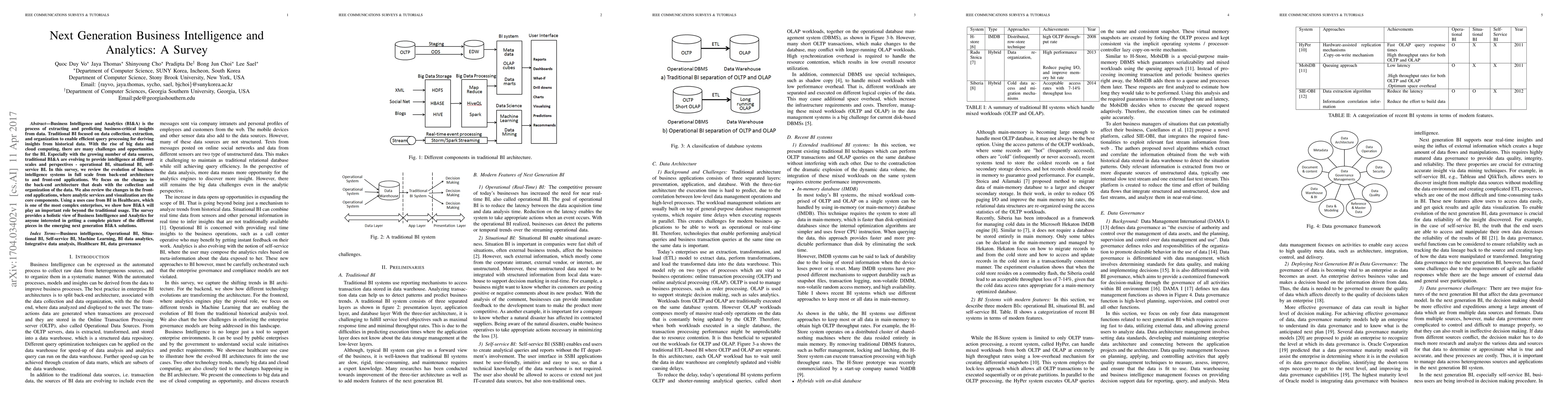 Business Intelligence and Analytics (BI&A) is the process of extracting and predicting business-critical insights from data. Traditional BI focused on data collection, extraction, and organization to enable efficient query processing for deriving insights from historical data. With the rise of big data and cloud computing, there are many challenges and opportunities for the BI. Especially with the growing number of data sources, traditional BI\&A are evolving to provide intelligence at different scales and perspectives - operational BI, situational BI, self-service BI. In this survey, we review the evolution of business intelligence systems in full scale from back-end architecture to and front-end applications. We focus on the changes in the back-end architecture that deals with the collection and organization of the data. We also review the changes in the front-end applications, where analytic services and visualization are the core components. Using a uses case from BI in Healthcare, which is one of the most complex enterprises, we show how BI\&A will play an important role beyond the traditional usage. The survey provides a holistic view of Business Intelligence and Analytics for anyone interested in getting a complete picture of the different pieces in the emerging next generation BI\&A solutions.