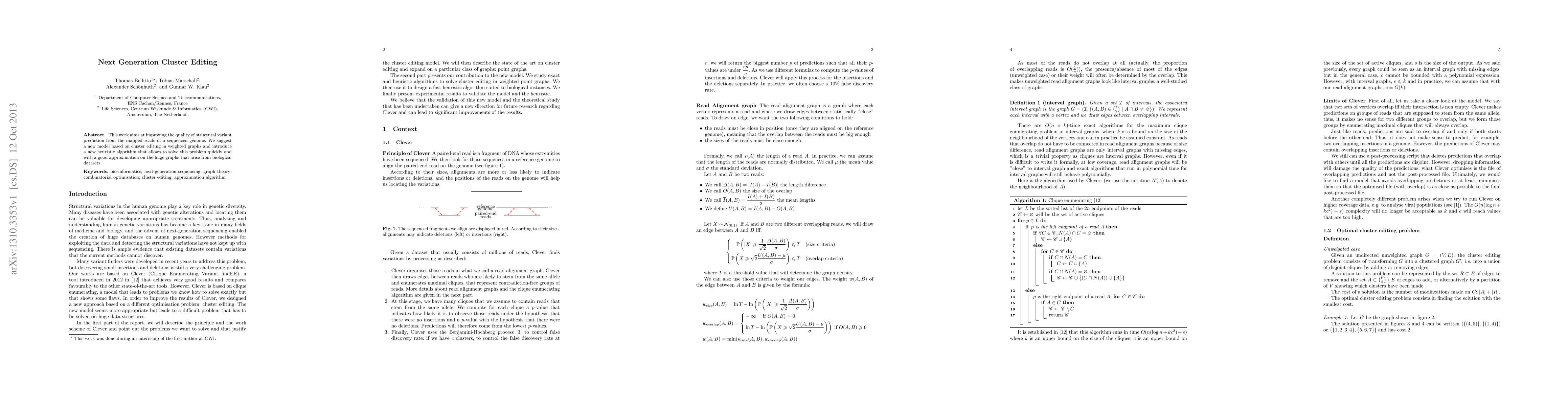 This work aims at improving the quality of structural variant prediction from the mapped reads of a sequenced genome. We suggest a new model based on cluster editing in weighted graphs and introduce a new heuristic algorithm that allows to solve this problem quickly and with a good approximation on the huge graphs that arise from biological datasets.