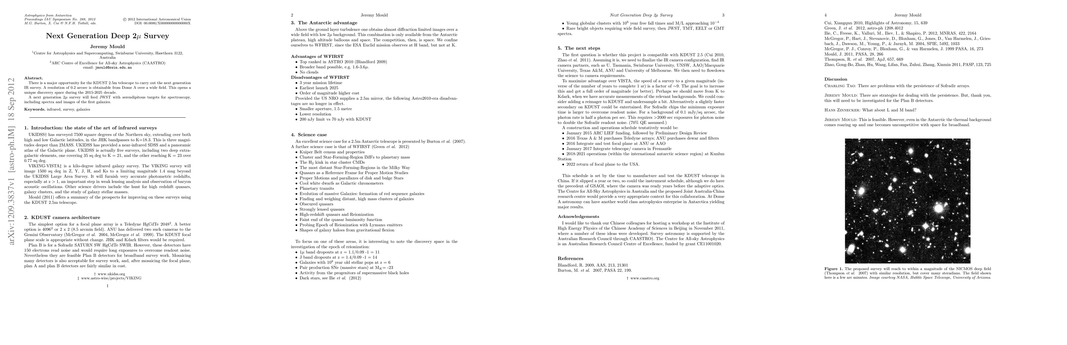 There is a major opportunity for the KDUST 2.5m telescope to carry out the next generation IR survey. A resolution of 0.2 arcsec is obtainable from Dome A over a wide field. This opens a unique discovery space during the 2015-2025 decade. A next generation 2 micron survey will feed JWST with serendipitous targets for spectroscopy, including spectra and images of the first galaxies.