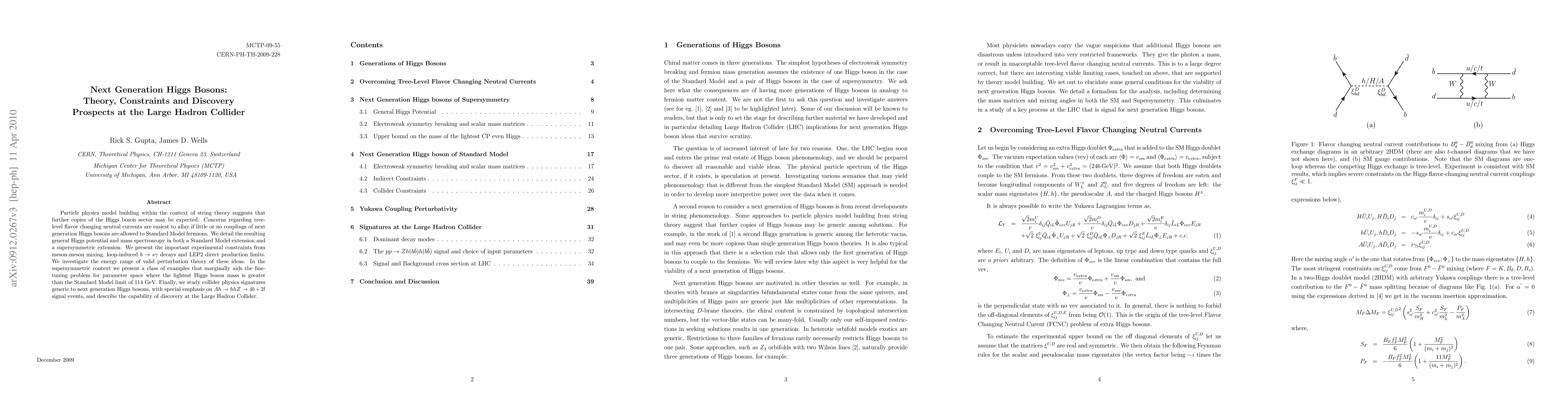 Particle physics model building within the context of string theory suggests that further copies of the Higgs boson sector may be expected. Concerns regarding tree-level flavor changing neutral currents are easiest to allay if little or no couplings of next generation Higgs bosons are allowed to Standard Model fermions. We detail the resulting general Higgs potential and mass spectroscopy in both a Standard Model extension and a supersymmetric extension. We present the important experimental constraints from meson-meson mixing, loop-induced $b\to s\gamma$ decays and LEP2 direct production limits. We investigate the energy range of valid perturbation theory of these ideas. In the supersymmetric context we present a class of examples that marginally aids the fine-tuning problem for parameter space where the lightest Higgs boson mass is greater than the Standard Model limit of 114 GeV. Finally, we study collider physics signatures generic to next generation Higgs bosons, with special emphasis on $Ah\to hhZ\to 4b+2l$ signal events, and describe the capability of discovery at the Large Hadron Collider.