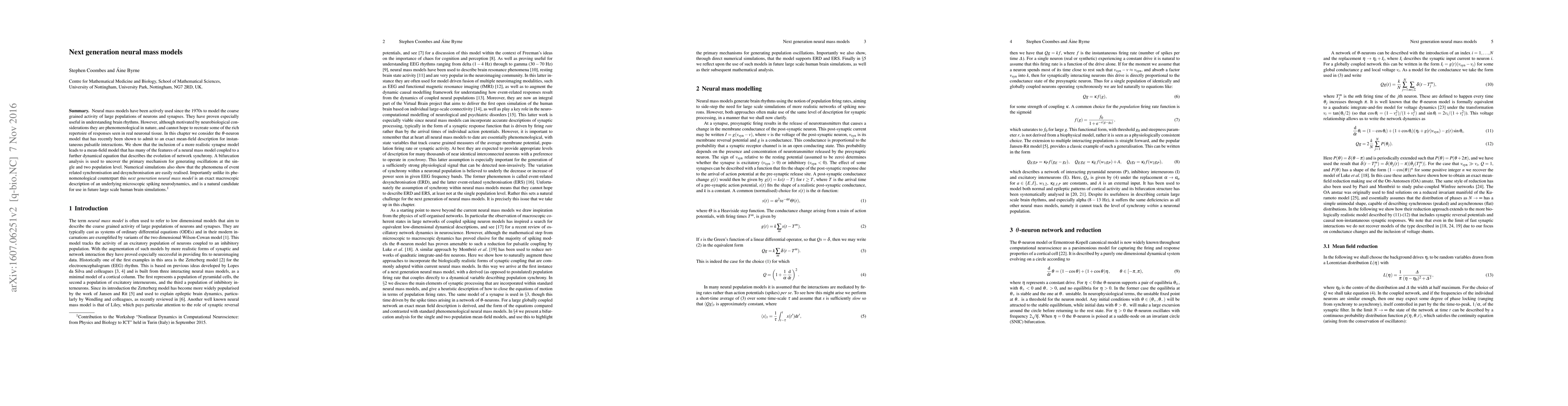 Neural mass models have been actively used since the 1970s to model the coarse grained activity of large populations of neurons and synapses. They have proven especially useful in understanding brain rhythms. However, although motivated by neurobiological considerations they are phenomenological in nature, and cannot hope to recreate some of the rich repertoire of responses seen in real neuronal tissue. In this chapter we consider the $\theta$-neuron model that has recently been shown to admit to an exact mean-field description for instantaneous pulsatile interactions. We show that the inclusion of a more realistic synapse model leads to a mean-field model that has many of the features of a neural mass model coupled to a further dynamical equation that describes the evolution of network synchrony. A bifurcation analysis is used to uncover the primary mechanism for generating oscillations at the single and two population level. Numerical simulations also show that the phenomena of event related synchronisation and desynchronisation are easily realised. Importantly unlike its phenomenological counterpart this \textit{next generation neural mass model} is an exact macroscopic description of an underlying microscopic spiking neurodynamics, and is a natural candidate for use in future large scale human brain simulations.
