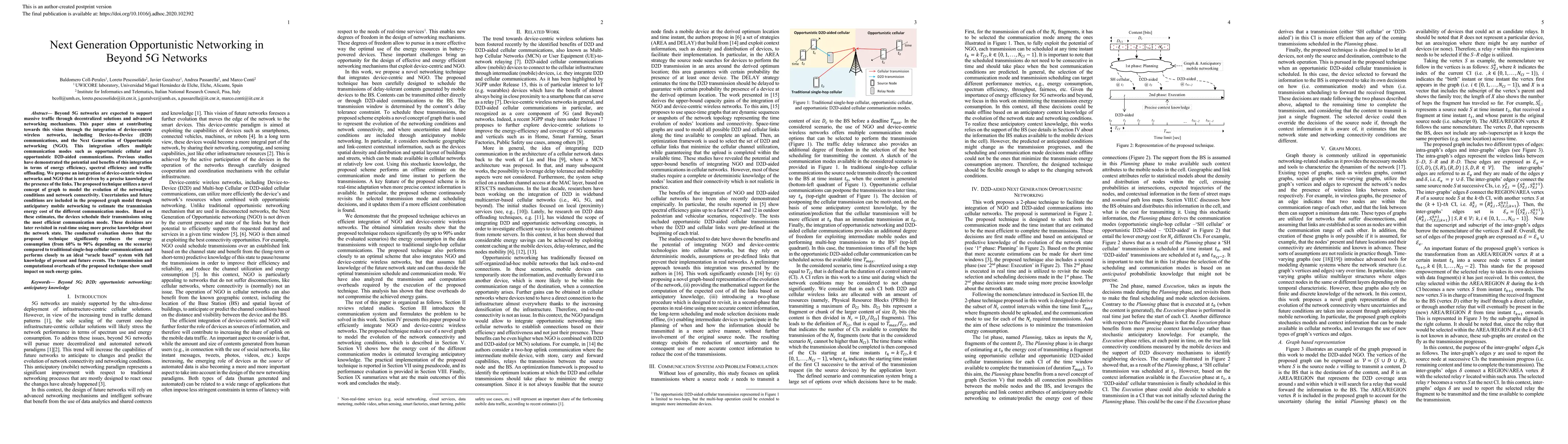 This paper proposes an integration of device-centric wireless networks and Next Generation Opportunistic Networking (NGO) to enhance energy efficiency in Beyond 5G networks. The technique uses a novel graph model to estimate transmission energy costs, enabling devices to schedule transmissions using the most efficient mode, with real-time adjustments based on network state knowledge. Evaluations show significant energy reductions compared to traditional cellular communications.