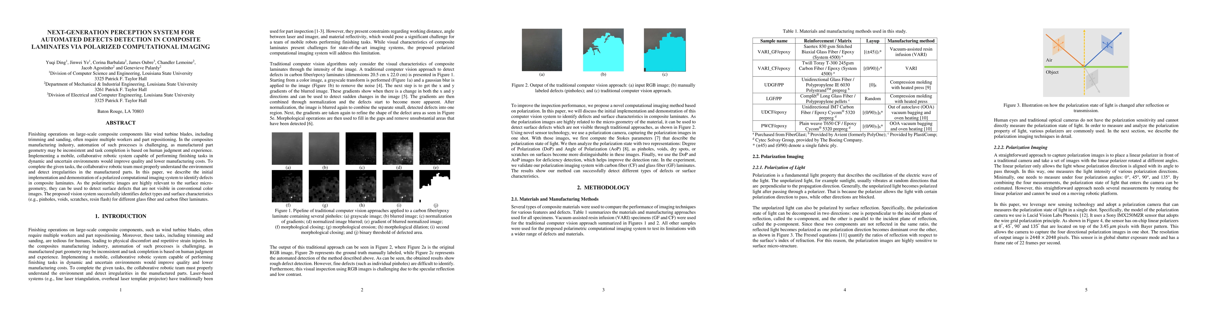 This paper presents a polarized computational imaging system for automated defect detection in composite laminates, enabling a collaborative robotic system to identify surface irregularities like pinholes and voids that are not visible in conventional images. The system's success in detecting defects enhances the quality and efficiency of finishing operations in the composites manufacturing industry.