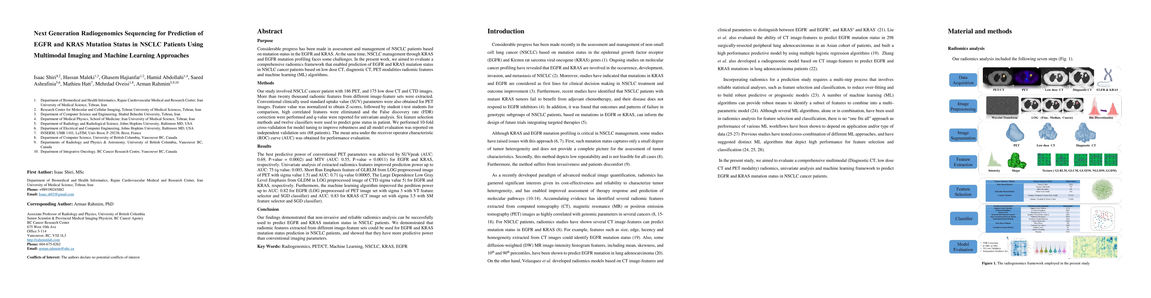 This paper presents a comprehensive radiomics framework using multimodal imaging and machine learning to predict EGFR and KRAS mutation status in NSCLC patients. The study found that radiomic features, especially from PET and CT images, significantly improved prediction accuracy compared to conventional imaging parameters, achieving AUCs up to 0.83.
