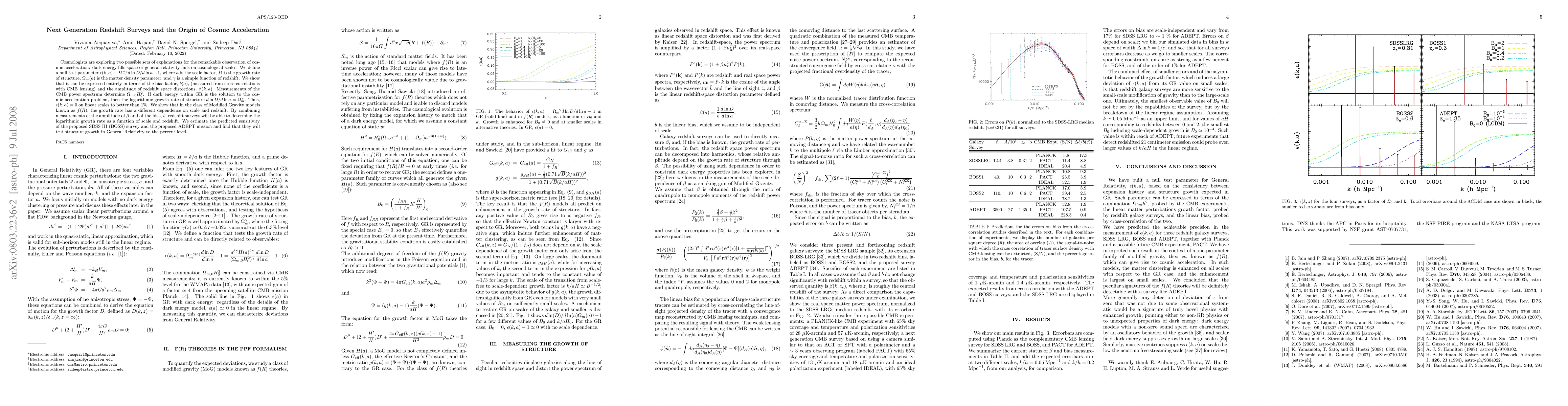 This paper explores the origins of cosmic acceleration, proposing a null test parameter $\epsilon(k,a)$ to distinguish between dark energy and Modified Gravity models. It demonstrates that redshift surveys can measure the growth rate of structure, allowing for tests of General Relativity at the percent level, as proposed by the SDSS III (BOSS) survey and the ADEPT mission.