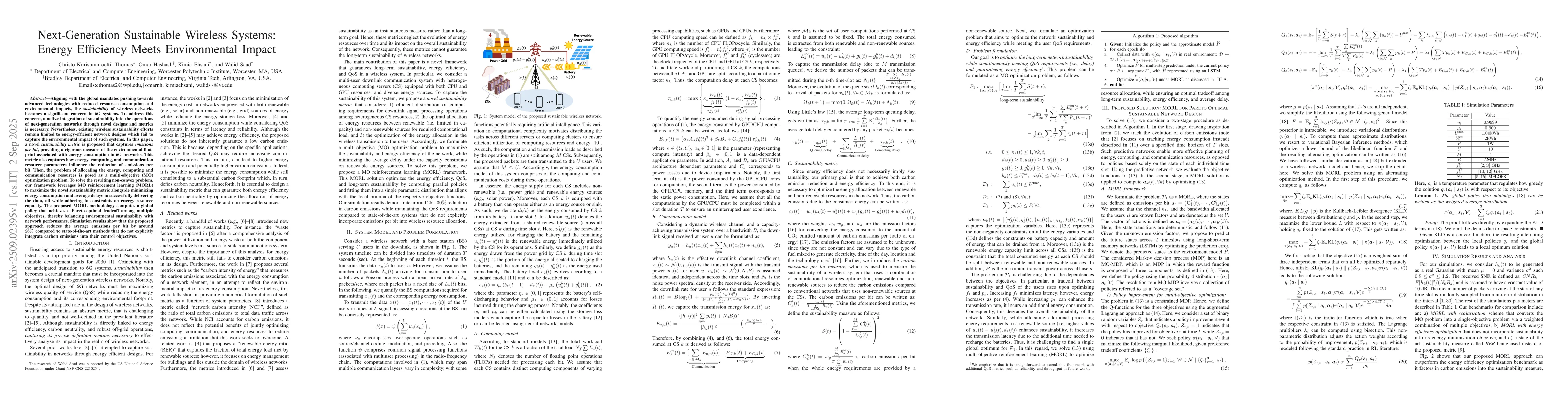 Aligning with the global mandates pushing towards advanced technologies with reduced resource consumption and environmental impacts, the sustainability of wireless networks becomes a significant concern in 6G systems. To address this concern, a native integration of sustainability into the operations of next-generation networks through novel designs and metrics is necessary. Nevertheless, existing wireless sustainability efforts remain limited to energy-efficient network designs which fail to capture the environmental impact of such systems. In this paper, a novel sustainability metric is proposed that captures emissions per bit, providing a rigorous measure of the environmental footprint associated with energy consumption in 6G networks. This metric also captures how energy, computing, and communication resource parameters influence the reduction of emissions per bit. Then, the problem of allocating the energy, computing and communication resources is posed as a multi-objective (MO) optimization problem. To solve the resulting non-convex problem, our framework leverages MO reinforcement learning (MORL) to maximize the novel sustainability metric alongside minimizing energy consumption and average delays in successfully delivering the data, all while adhering to constraints on energy resource capacity. The proposed MORL methodology computes a global policy that achieves a Pareto-optimal tradeoff among multiple objectives, thereby balancing environmental sustainability with network performance. Simulation results show that the proposed approach reduces the average emissions per bit by around 26% compared to state-of-the-art methods that do not explicitly integrate carbon emissions into their control objectives.