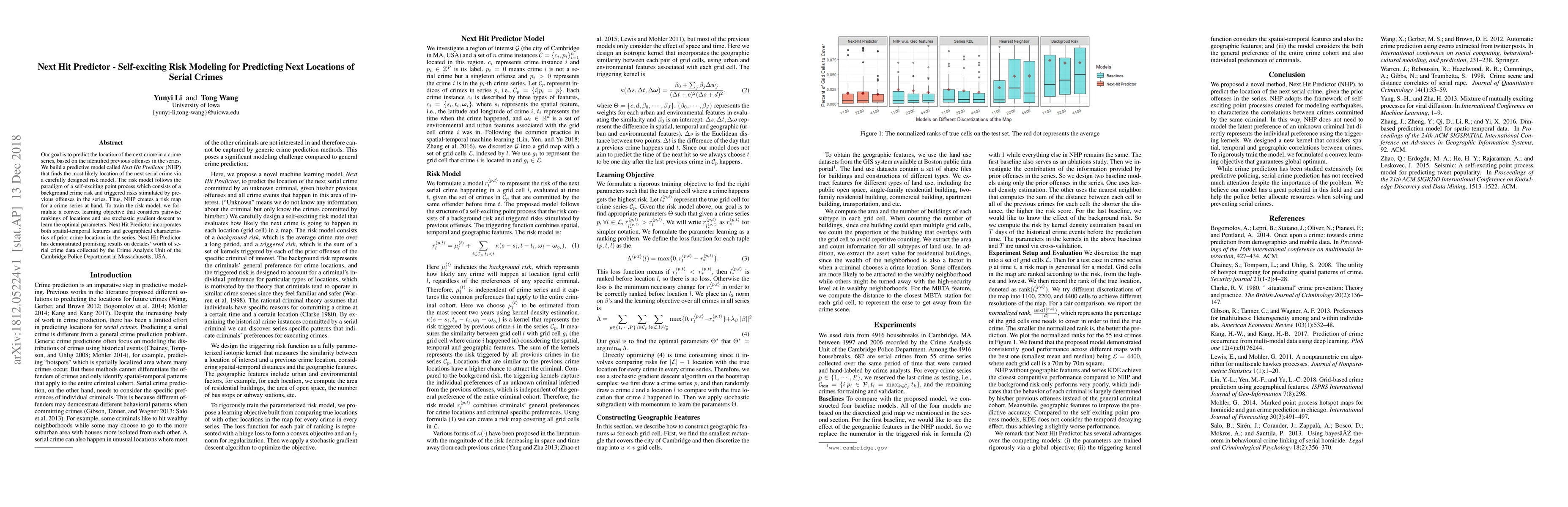 Our goal is to predict the location of the next crime in a crime series, based on the identified previous offenses in the series. We build a predictive model called Next Hit Predictor (NHP) that finds the most likely location of the next serial crime via a carefully designed risk model. The risk model follows the paradigm of a self-exciting point process which consists of a background crime risk and triggered risks stimulated by previous offenses in the series. Thus, NHP creates a risk map for a crime series at hand. To train the risk model, we formulate a convex learning objective that considers pairwise rankings of locations and use stochastic gradient descent to learn the optimal parameters. Next Hit Predictor incorporates both spatial-temporal features and geographical characteristics of prior crime locations in the series. Next Hit Predictor has demonstrated promising results on decades' worth of serial crime data collected by the Crime Analysis Unit of the Cambridge Police Department in Massachusetts, USA.