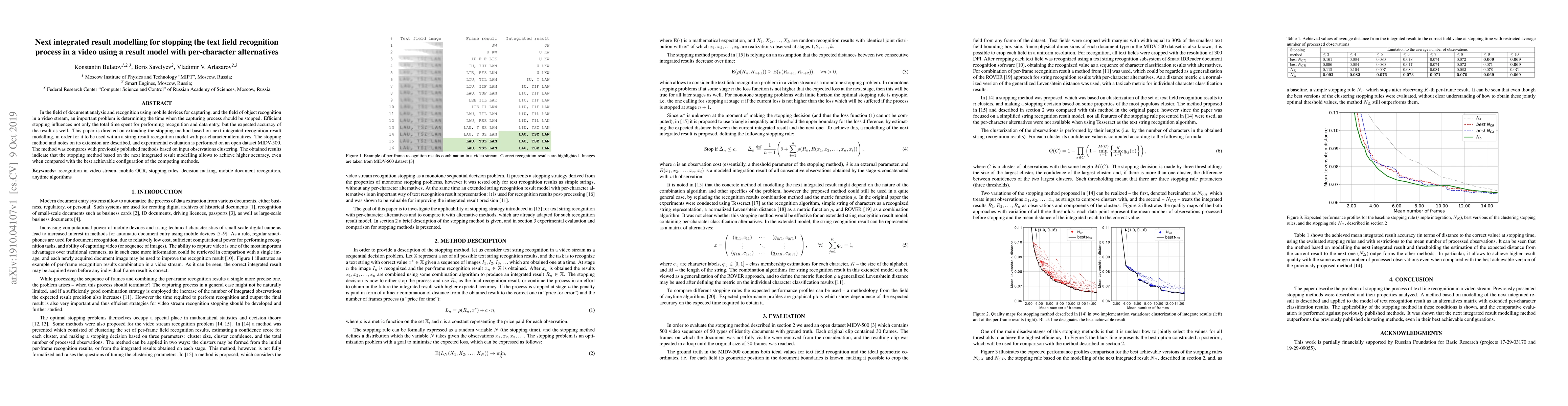 This paper proposes an advanced stopping method for text field recognition in videos using next integrated result modelling with per-character alternatives, achieving higher recognition accuracy compared to existing input observation clustering methods, as demonstrated through experiments on the MIDV-500 dataset.