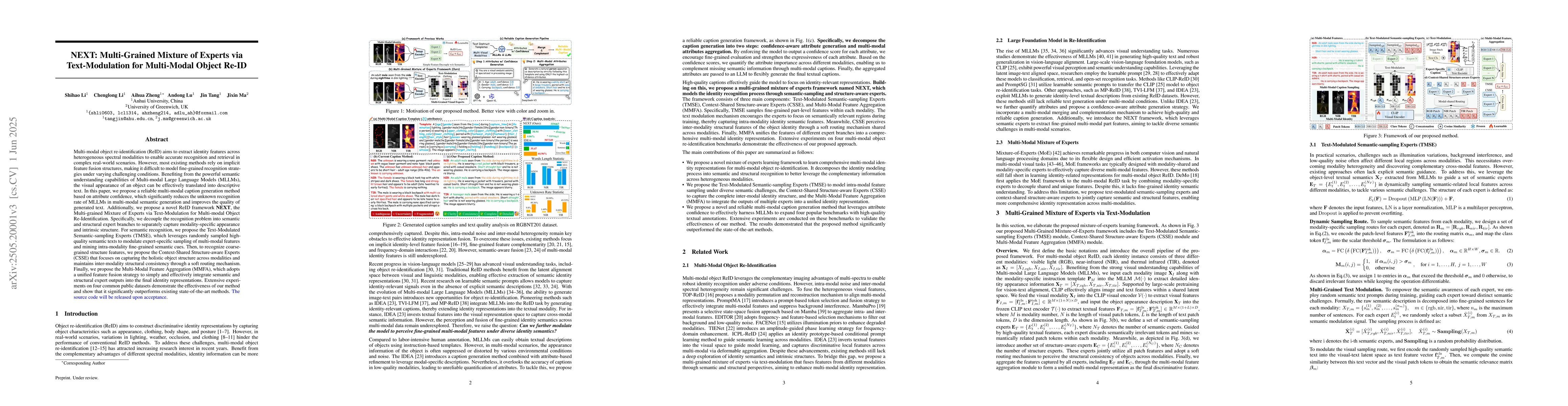 The research proposes a multi-modal caption generation method based on attribute confidence, utilizing Multi-modal Large Language Models (MLLMs) to translate visual appearance into descriptive text. It introduces a novel ReID framework, NEXT, which employs a Multi-grained Mixture of Experts via Text-Modulation for multi-modal object Re-ID. NEXT decouples recognition into semantic and structural expert branches, using Text-Modulated Semantic-sampling Experts (TMSE) for fine-grained semantic cues and Context-Shared Structure-aware Experts (CSSE) for holistic object structure. A Multi-Modal Feature Aggregation (MMFA) is also proposed for unified feature fusion.