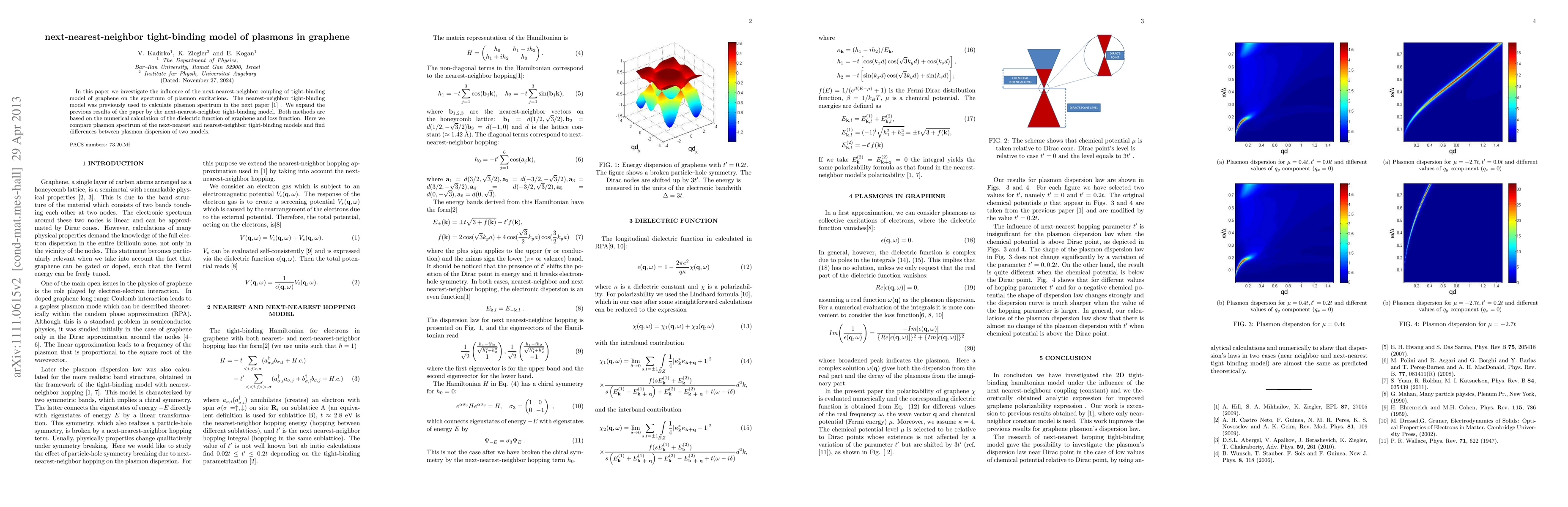 In this paper we investigate the influence of the next-nearest-neighbor coupling of tight-binding model of graphene on the spectrum of plasmon excitations. The nearest-neighbor tight-binding model was previously used to calculate plasmon spectrum in the next paper [1]. We expand the previous results of the paper by the next-nearest-neighbor tight-binding model. Both methods are based on the numerical calculation of the dielectric function of graphene and loss function. Here we compare plasmon spectrum of the next-nearest and nearest-neighbor tight-binding models and find differences between plasmon dispersion of two models.
