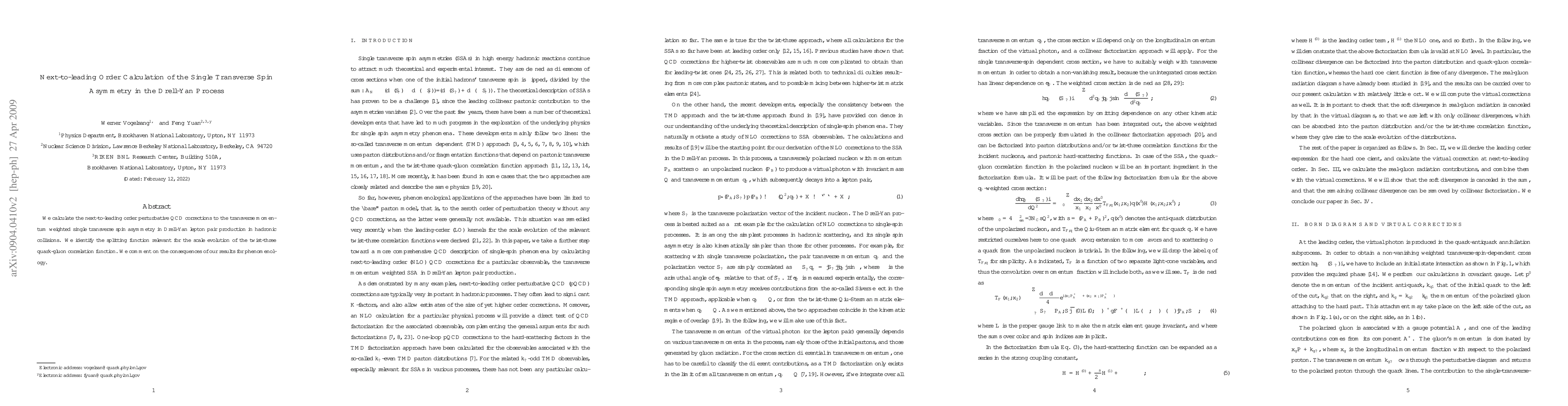 This paper calculates the next-to-leading order QCD corrections for the single transverse spin asymmetry in the Drell-Yan process, identifying the relevant splitting function for the evolution of twist-three quark-gluon correlations. The findings have implications for the phenomenology of spin-dependent processes in hadronic collisions.