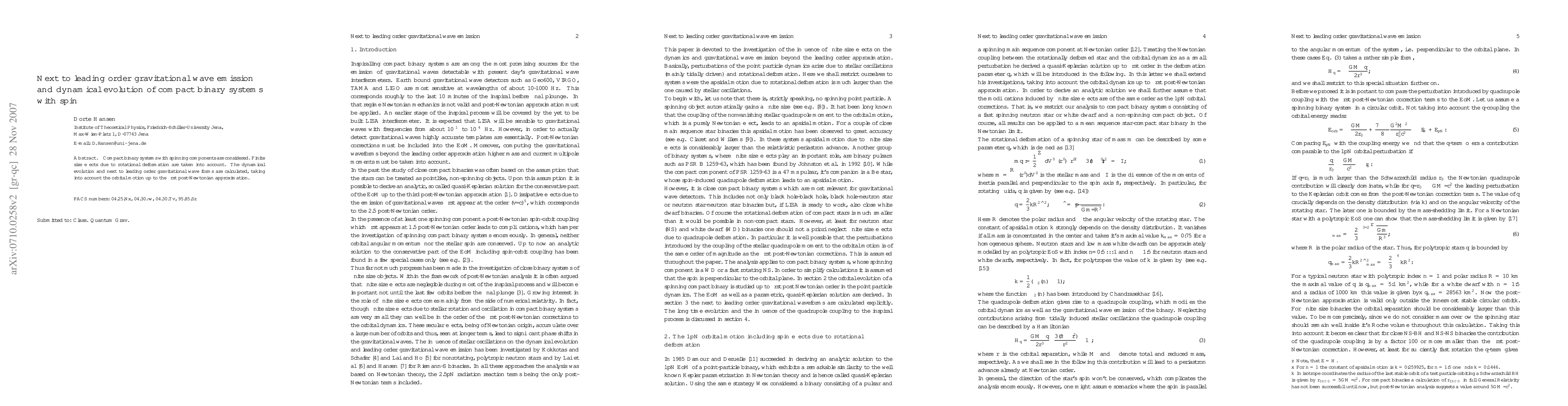 Compact binary systems with spinning components are considered. Finite size effects due to rotational deformation are taken into account. The dynamical evolution and next to leading order gravitational wave forms are calculated, taking into account the orbital motion up to the first post-Newtonian approximation.