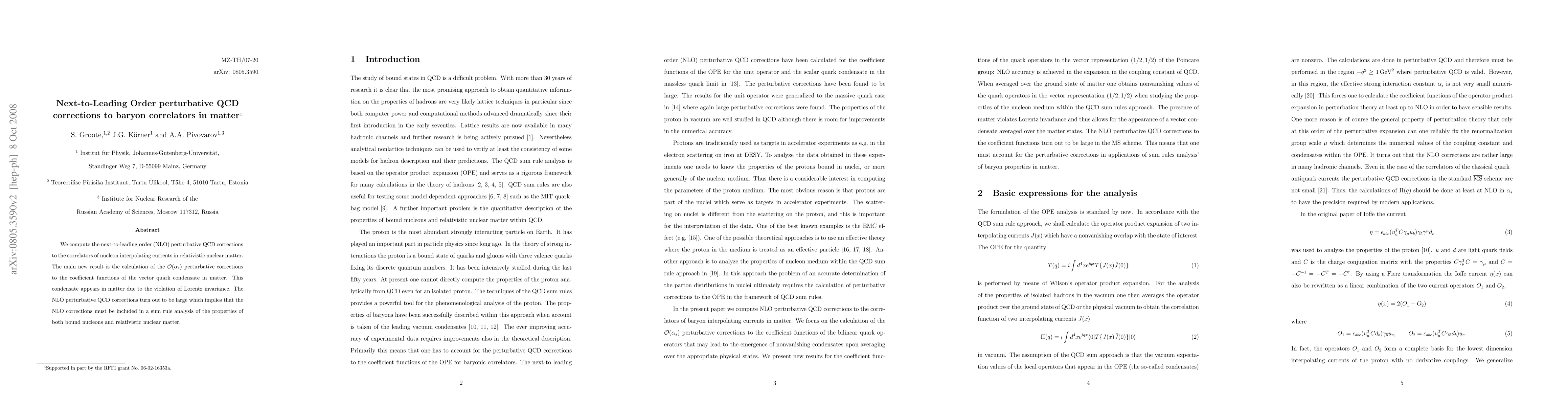 We compute the next-to-leading order perturbative QCD corrections to the correlators of nucleon interpolating currents in relativistic nuclear matter. The main new result is the calculation of the O(alpha_s) perturbative corrections to the coefficient functions of the vector quark condensate in matter. This condensate appears in matter due to the violation of Lorentz invariance. The NLO perturbative QCD corrections turn out to be large which implies that the NLO corrections must be included in a sum rule analysis of the properties of both bound nucleons and relativistic nuclear matter.