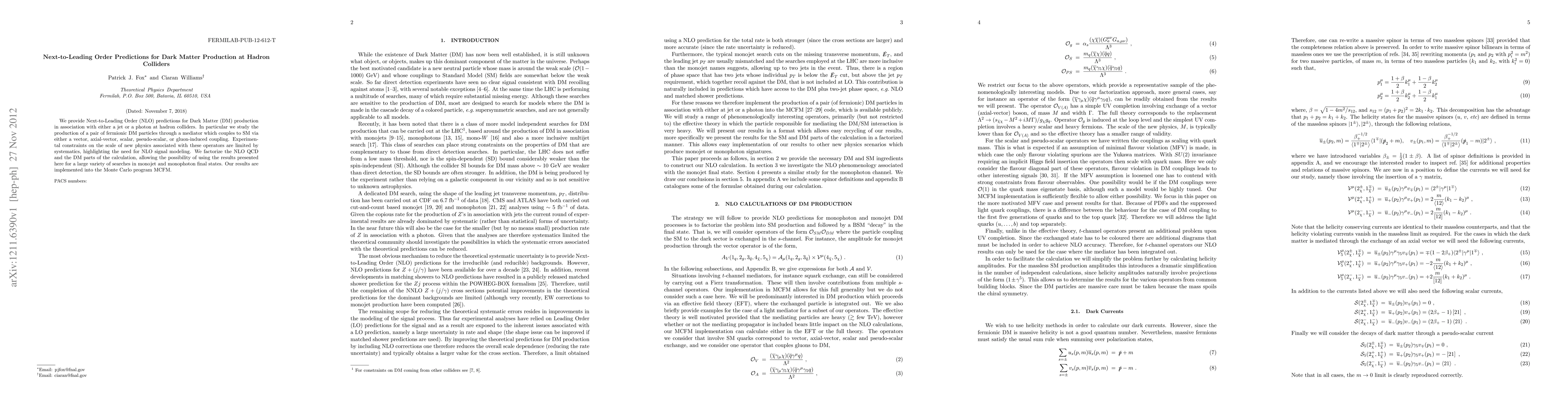 This paper presents Next-to-Leading Order (NLO) predictions for Dark Matter production at hadron colliders, focusing on pairs of fermionic DM particles via various mediator couplings. The study aims to improve signal modeling for experimental searches in monojet and monophoton final states, and the results are implemented in the MCFM Monte Carlo program.