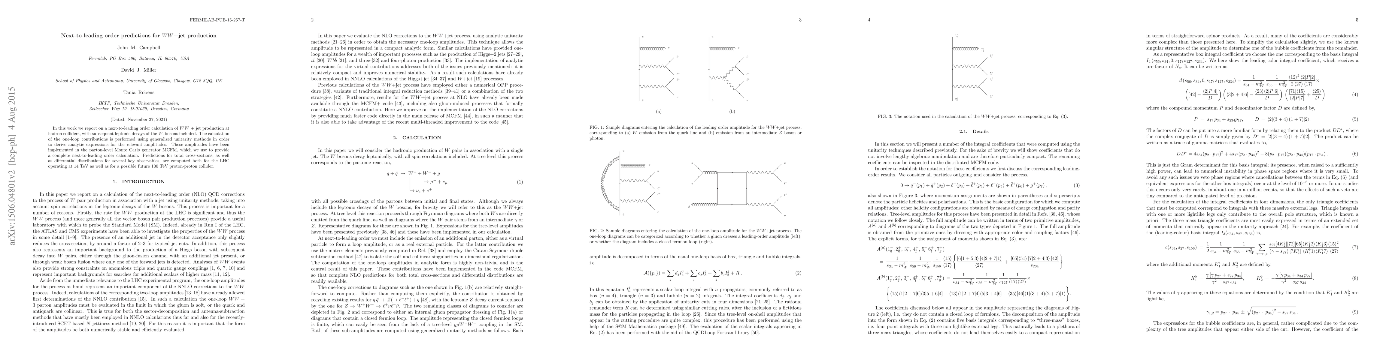 In this work we report on a next-to-leading order calculation of WW + jet production at hadron colliders, with subsequent leptonic decays of the W-bosons included. The calculation of the one-loop contributions is performed using generalized unitarity methods in order to derive analytic expressions for the relevant amplitudes. These amplitudes have been implemented in the parton-level Monte Carlo generator MCFM, which we use to provide a complete next-to-leading order calculation. Predictions for total cross-sections, as well as differential distributions for several key observables, are computed both for the LHC operating at 14 TeV as well as for a possible future 100 TeV proton-proton collider.