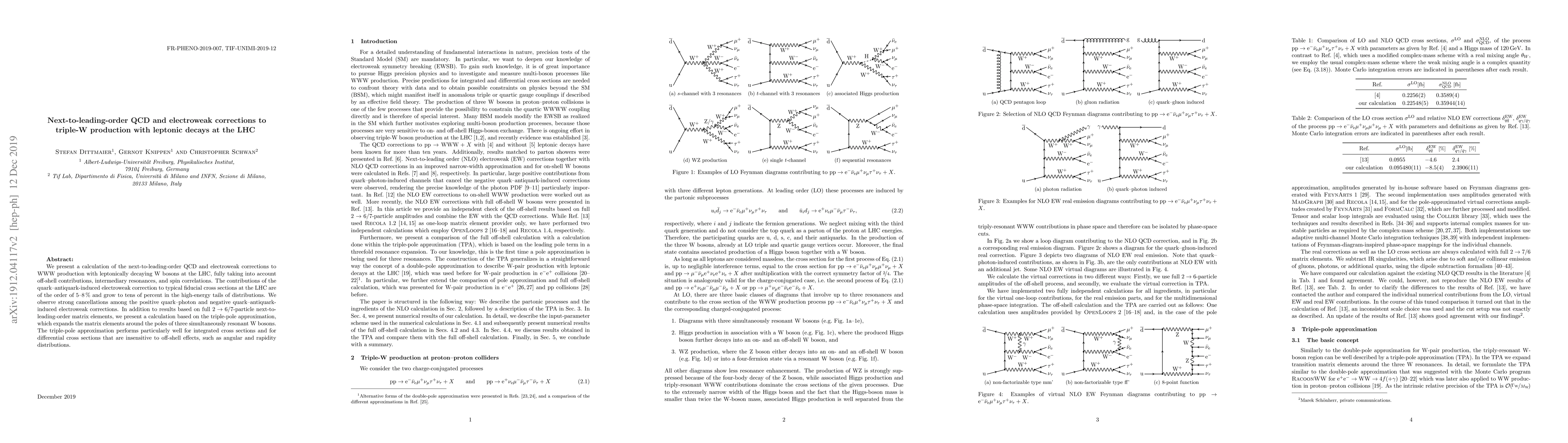 This paper calculates next-to-leading-order QCD and electroweak corrections for triple-W production at the LHC, finding significant contributions of 5-8% in typical fiducial cross sections. The study also introduces a triple-pole approximation that effectively handles resonant cross sections and distributions.