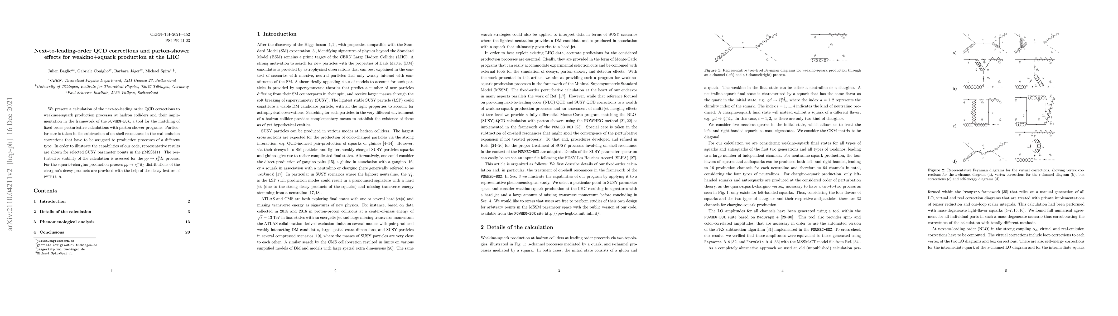 We present a calculation of the next-to-leading order QCD corrections to weakino+squark production processes at hadron colliders and their implementation in the framework of the POWHEG-BOX, a tool for the matching of fixed-order perturbative calculations with parton-shower programs. Particular care is taken in the subtraction of on-shell resonances in the real-emission corrections that have to be assigned to production processes of a different type. In order to illustrate the capabilities of our code, representative results are shown for selected SUSY parameter points in the pMSSM11. The perturbative stability of the calculation is assessed for the $ pp \rightarrow \tilde{\chi}^0_1 \tilde{d}_L $ process. For the squark+chargino production process $ pp \rightarrow \tilde{\chi}_1^- \tilde{u}_L $ distributions of the chargino's decay products are provided with the help of the decay feature of PYTHIA 8.
