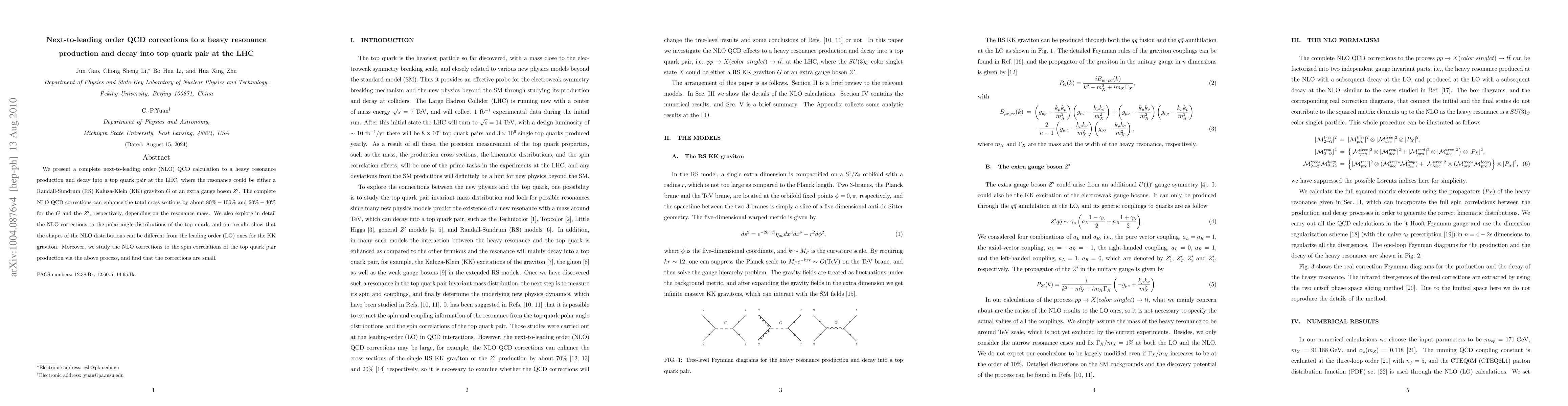 We present a complete next-to-leading order (NLO) QCD calculation to a heavy resonance production and decay into a top quark pair at the LHC, where the resonance could be either a Randall-Sundrum (RS) Kaluza-Klein (KK) graviton $G$ or an extra gauge boson $Z'$. The complete NLO QCD corrections can enhance the total cross sections by about $80\%- 100\%$ and $20\%- 40\%$ for the $G$ and the $Z'$, respectively, depending on the resonance mass. We also explore in detail the NLO corrections to the polar angle distributions of the top quark, and our results show that the shapes of the NLO distributions can be different from the leading order (LO) ones for the KK graviton. Moreover, we study the NLO corrections to the spin correlations of the top quark pair production via the above process, and find that the corrections are small.