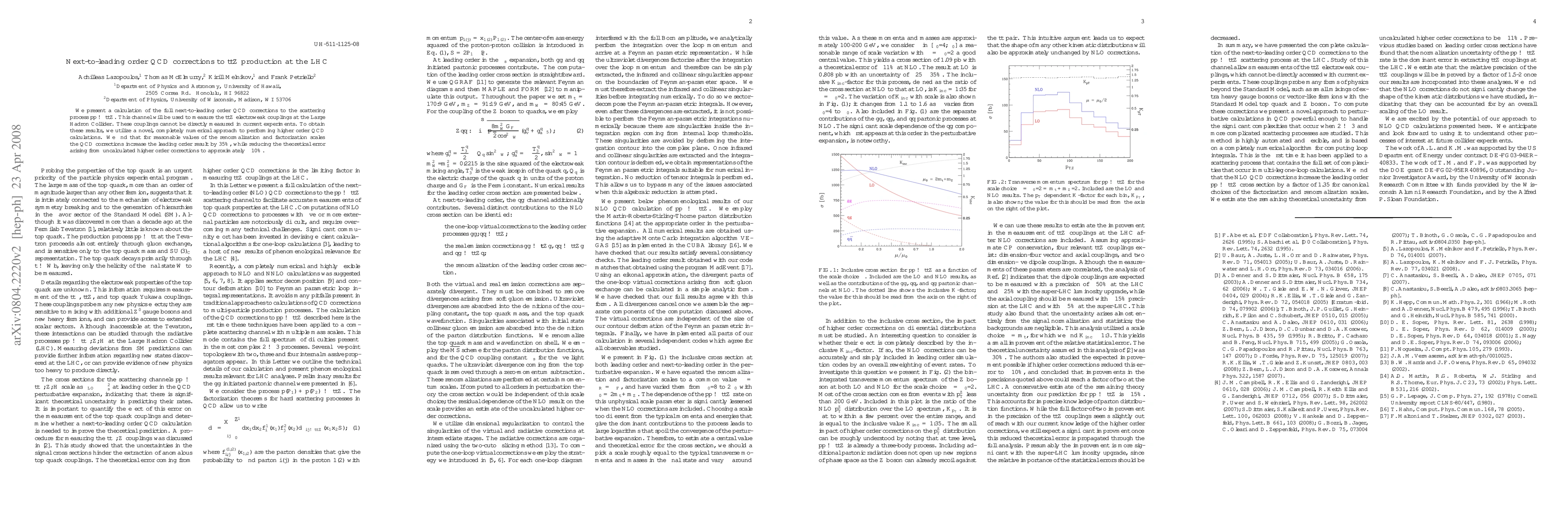 We present a calculation of the full next-to-leading order QCD corrections to the scattering process pp \to t tbar Z. This channel will be used to measure the t tbar Z electroweak couplings at the Large Hadron Collider. These couplings cannot be directly measured in current experiments. To obtain these results, we utilize a novel, completely numerical approach to performing higher order QCD calculations. We find that for reasonable values of the renormalization and factorization scales the QCD corrections increase the leading order result by 35 percent, while reducing the theoretical error arising from uncalculated higher order corrections to approximately 10 percent.