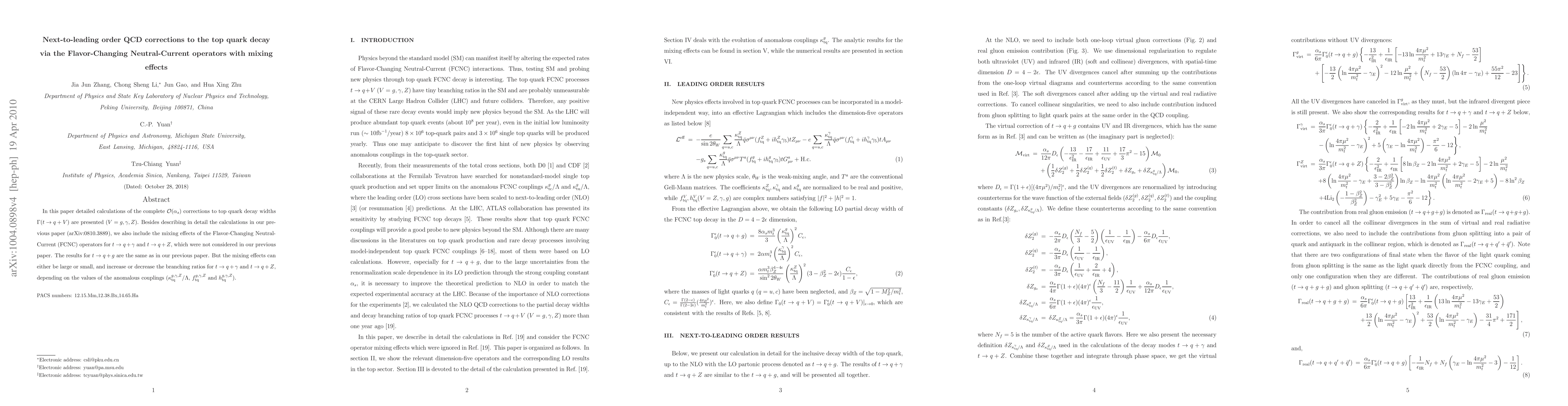 In this paper detailed calculations of the complete $\mathcal{O}(\alpha_s)$ corrections to top quark decay widths $\Gamma(t\to q+V)$ are presented ($V=g,\gamma,Z$). Besides describing in detail the calculations in our previous paper (arXiv:0810.3889), we also include the mixing effects of the Flavor-Changing Neutral-Current (FCNC) operators for $t\to q+\gamma$ and $t\to q+Z$, which were not considered in our previous paper. The results for $t\to q+g$ are the same as in our previous paper. But the mixing effects can either be large or small, and increase or decrease the branching ratios for $t\to q+\gamma$ and $t\to q+Z$, depending on the values of the anomalous couplings ($\kappa^{g,\gamma,Z}_{\mathrm{tq}}/\Lambda$, $f^{g,\gamma,Z}_{\mathrm{tq}}$ and $h^{g,\gamma,Z}_{\mathrm{tq}}$).