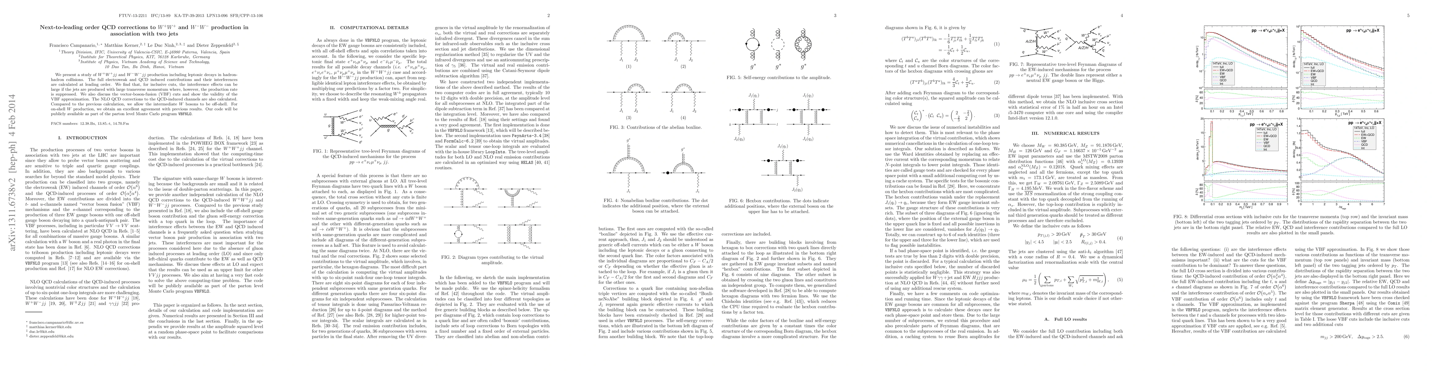 We present a study of $W^+W^+jj$ and $W^-W^-jj$ production including leptonic decays in hadron-hadron collisions. The full electroweak and QCD induced contributions and their interferences are calculated at leading order. We find that, for inclusive cuts, the interference effects can be large if the jets are produced with large transverse momentum where, however, the production rate is suppressed. We also discuss the vector-boson-fusion (VBF) cuts and show the validity of the VBF approximation. The NLO QCD corrections to the QCD-induced channels are also calculated. Compared to the previous calculation, we allow the intermediate $W$ bosons to be off-shell. For on-shell $W$ production, we obtain an excellent agreement with previous results. Our code will be publicly available as part of the parton level Monte Carlo program VBFNLO.