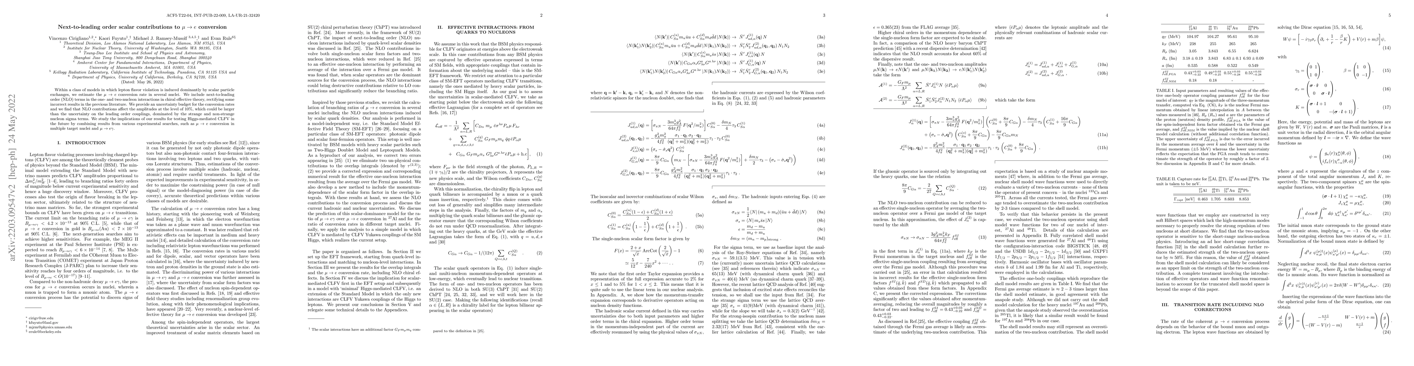 Within a class of models in which lepton flavor violation is induced dominantly by scalar particle exchanges, we estimate the $\mu \to e$ conversion rate in several nuclei. We include next-to-leading order (NLO) terms in the one- and two-nucleon interactions in chiral effective theory, rectifying some incorrect results in the previous literature. We provide an uncertainty budget for the conversion rates and we find that NLO contributions affect the amplitudes at the level of $10\%$, which could be larger than the uncertainty on the leading order couplings, dominated by the strange and non-strange nucleon sigma terms. We study the implications of our results for testing Higgs-mediated CLFV in the future by combining results from various experimental searches, such as $\mu \to e$ conversion in multiple target nuclei and $\mu \to e \gamma$.