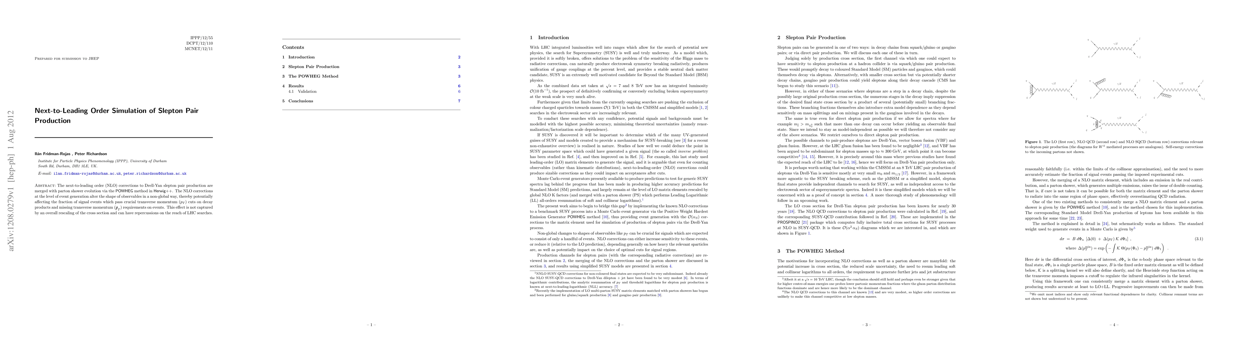 The next-to-leading order (NLO) corrections to Drell-Yan slepton pair production are merged with parton shower evolution via the POWHEG method in Herwig++. The NLO corrections at the level of event generation alter the shape of observables in a non-global way, thereby potentially affecting the fraction of signal events which pass crucial transverse momentum cuts on decay products and missing transverse momentum requirements on events. This effect is not captured by an overall rescaling of the cross section and can have repercussions on the reach of LHC searches.