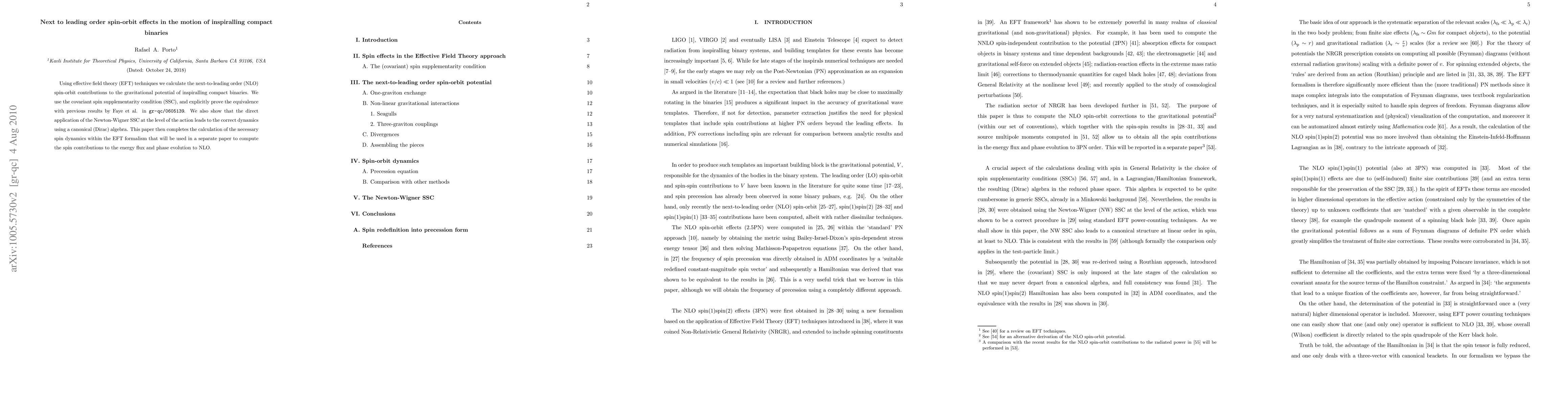 This paper calculates next-to-leading order spin-orbit effects in the gravitational potential of inspiralling compact binaries using effective field theory techniques. It confirms the equivalence with previous results and demonstrates the correct dynamics using the covariant spin supplementarity condition.