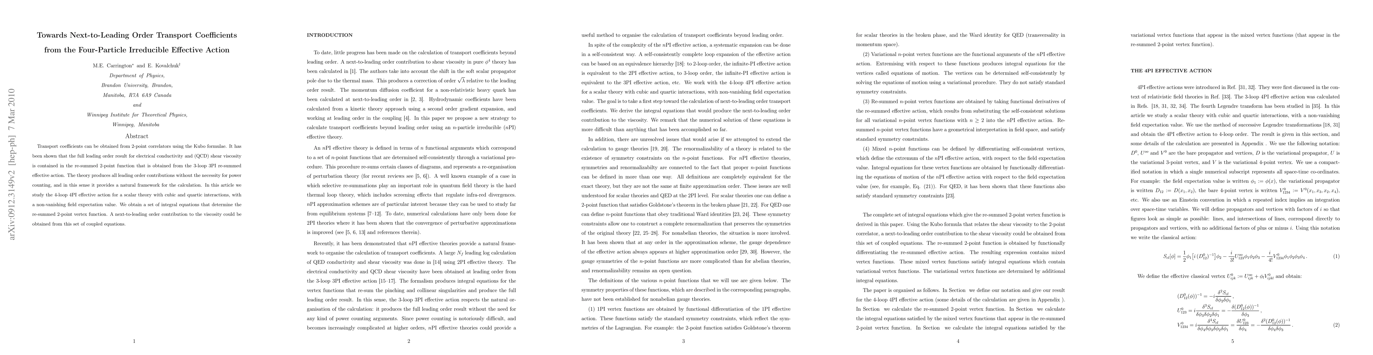 Transport coefficients can be obtained from 2-point correlators using the Kubo formulae. It has been shown that the full leading order result for electrical conductivity and (QCD) shear viscosity is contained in the re-summed 2-point function that is obtained from the 3-loop 3PI re-summed effective action. The theory produces all leading order contributions without the necessity for power counting, and in this sense it provides a natural framework for the calculation. In this article we study the 4-loop 4PI effective action for a scalar theory with cubic and quartic interactions in the presence of spontaneous symmetry breaking. We obtain a set of integral equations that determine the re-summed 2-point vertex function. A next-to-leading order contribution to the viscosity could be obtained from this set of coupled equations.
