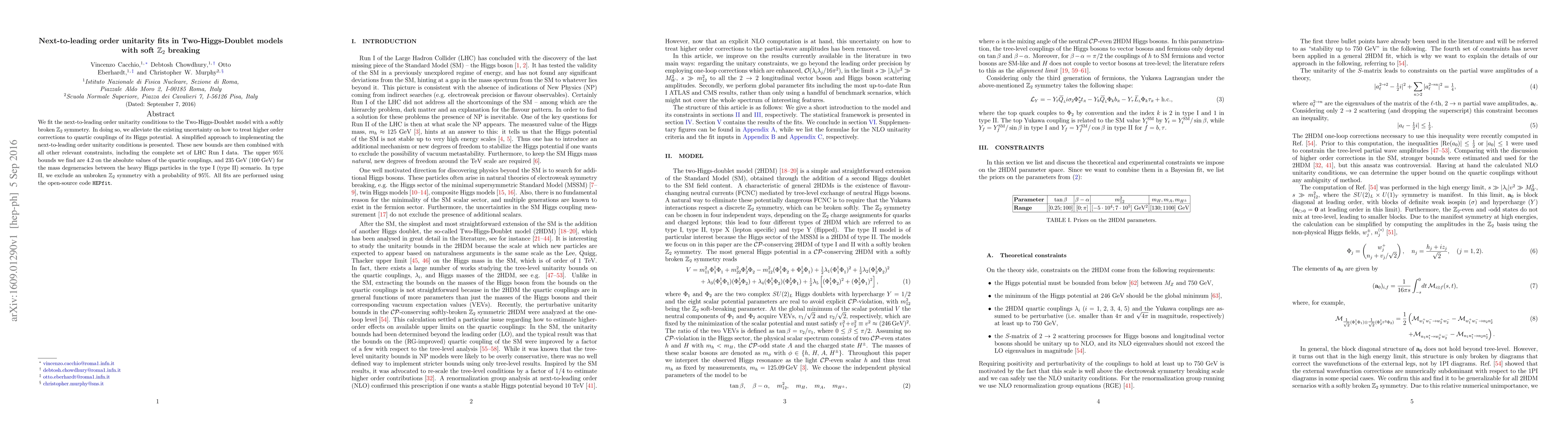 This research applies next-to-leading order unitarity conditions to the Two-Higgs-Doublet model with soft Z2 symmetry breaking, presenting a simplified implementation approach. Combining these bounds with LHC Run I data, they establish upper 95% limits of 4.2 for quartic couplings and 235 GeV (100 GeV) for heavy Higgs mass degeneracies in type I and II scenarios, excluding an unbroken Z2 symmetry in type II with 95% probability using the HEPfit code.