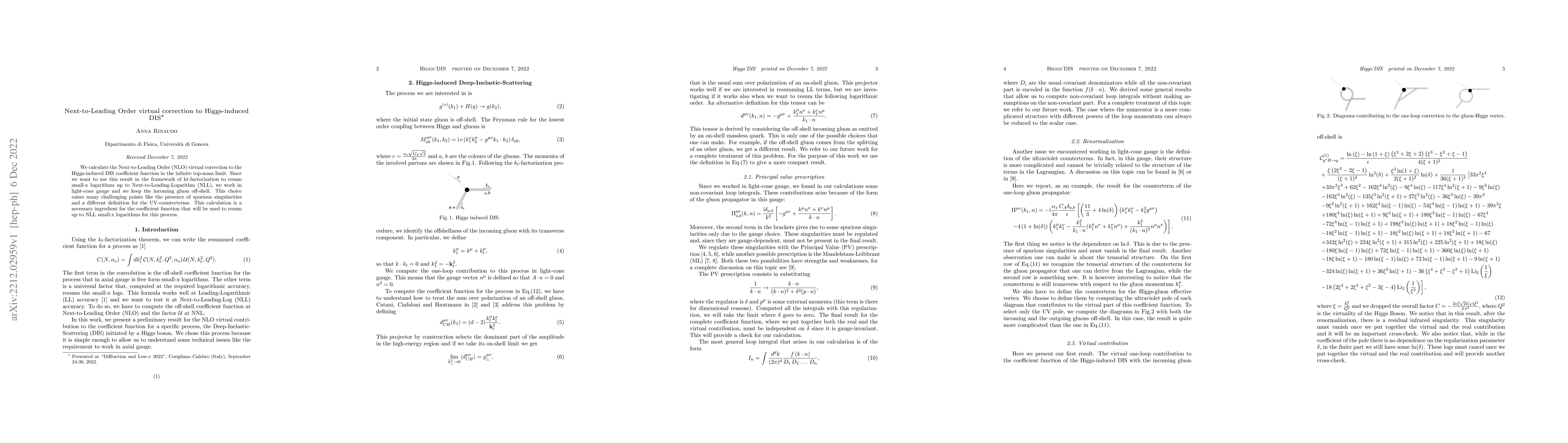 This paper calculates the Next-to-Leading Order (NLO) virtual correction to the Higgs-induced Deep Inelastic Scattering (DIS) coefficient function in the infinite top-mass limit, employing light-cone gauge and off-shell gluons. This result is crucial for resummation of small-x logarithms up to Next-to-Leading-Logarithm (NLL) in the kt-factorization framework.