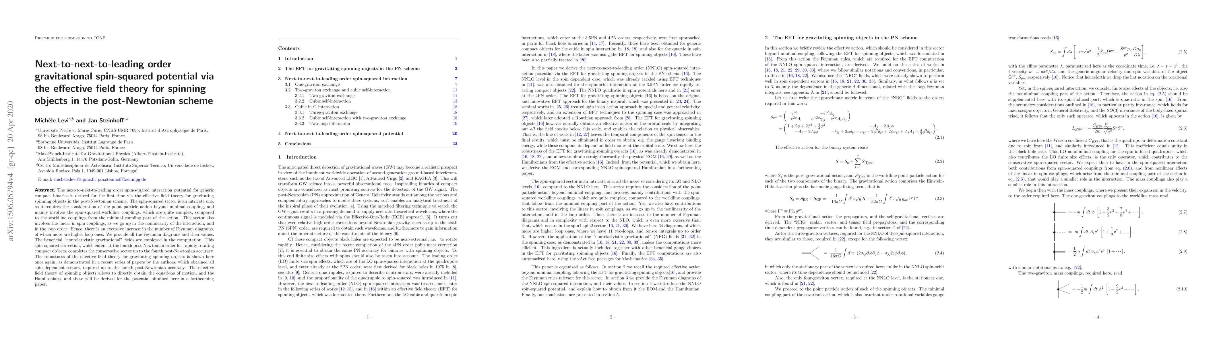 The next-to-next-to-leading order spin-squared interaction potential for generic compact binaries is derived for the first time via the effective field theory for gravitating spinning objects in the post-Newtonian scheme. The spin-squared sector is an intricate one, as it requires the consideration of the point particle action beyond minimal coupling, and mainly involves the spin-squared worldline couplings, which are quite complex, compared to the worldline couplings from the minimal coupling part of the action. This sector also involves the linear in spin couplings, as we go up in the nonlinearity of the interaction, and in the loop order. Hence, there is an excessive increase in the number of Feynman diagrams, of which more are higher loop ones. We provide all the Feynman diagrams and their values. The beneficial nonrelativistic gravitational fields are employed in the computation. This spin-squared correction, which enters at the fourth post-Newtonian order for rapidly rotating compact objects, completes the conservative sector up to the fourth post-Newtonian accuracy. The robustness of the effective field theory for gravitating spinning objects is shown here once again, as demonstrated in a recent series of papers by the authors, which obtained all spin dependent sectors, required up to the fourth post-Newtonian accuracy. The effective field theory of spinning objects allows to directly obtain the equations of motion, and the Hamiltonians, and these will be derived for the potential obtained here in a forthcoming paper.