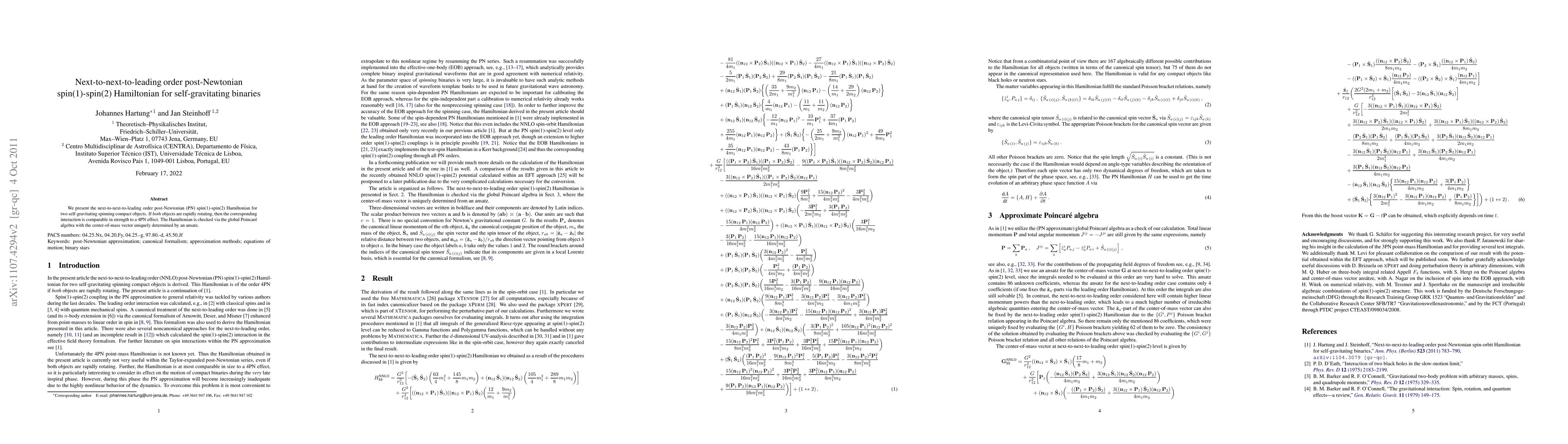 This paper develops the next-to-next-to-leading order post-Newtonian spin(1)-spin(2) Hamiltonian for rapidly rotating self-gravitating binaries, showing that their interaction can rival a 4PN effect. The Hamiltonian's validity is confirmed through the global Poincaré algebra.