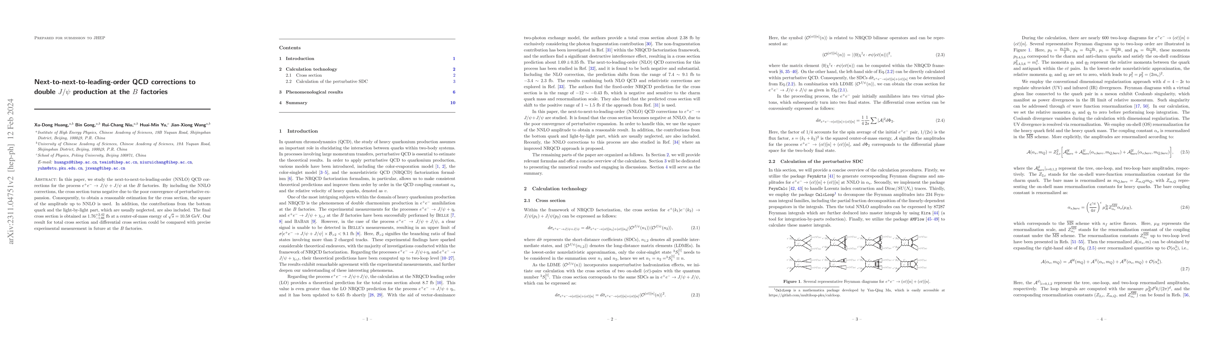 This paper investigates next-to-next-to-leading-order (NNLO) QCD corrections for double $J/\psi$ production in $e^+e^-$ collisions at $B$ factories, finding that the cross section becomes negative due to poor convergence. The final estimated cross section is $1.76^{+2.42}_{-1.66} ~{\rm fb}$ at $\sqrt{s}=10.58$ GeV, including contributions from bottom quarks and light-by-light parts.