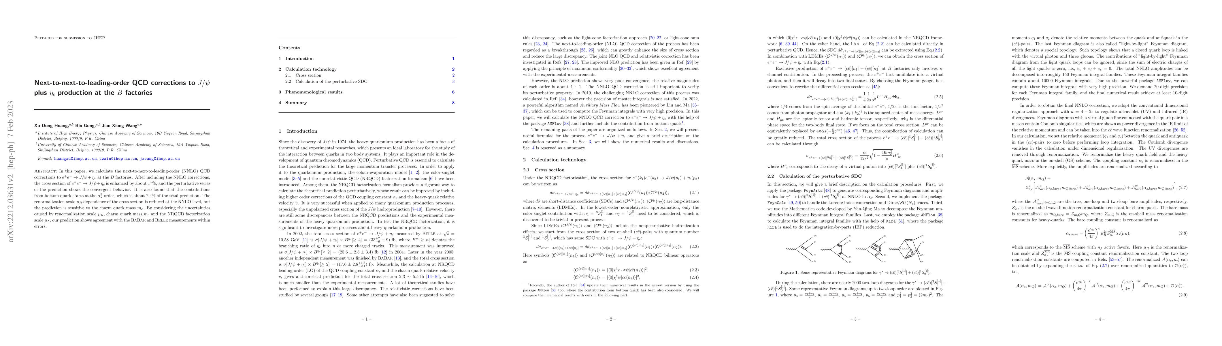 This paper calculates next-to-next-to-leading-order QCD corrections for $e^+e^- \to J/\psi+\eta_c$ production at $B$ factories, enhancing the cross section by about 17% and improving convergence. The bottom quark's contribution starts at $\alpha_s^3$-order, and the prediction aligns with experimental measurements considering uncertainties in $\mu_R$, $m_c$, and $\mu_\Lambda$.