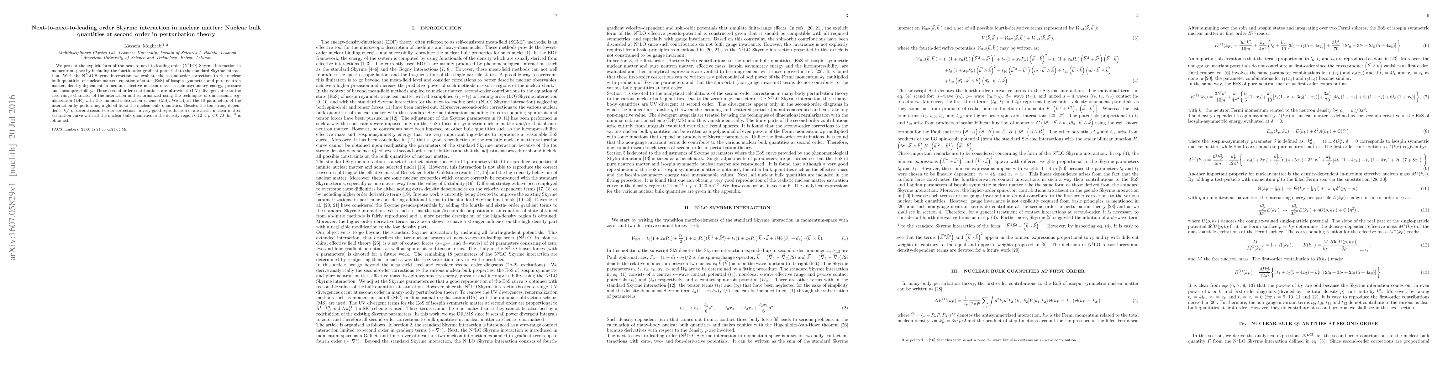 This paper develops the next-to-next-to-leading order (N$^2$LO) Skyrme interaction, including fourth-order gradient terms, to evaluate second-order corrections to nuclear bulk quantities, which are renormalized using dimensional regularization. The model accurately reproduces nuclear matter saturation properties within a realistic density range.