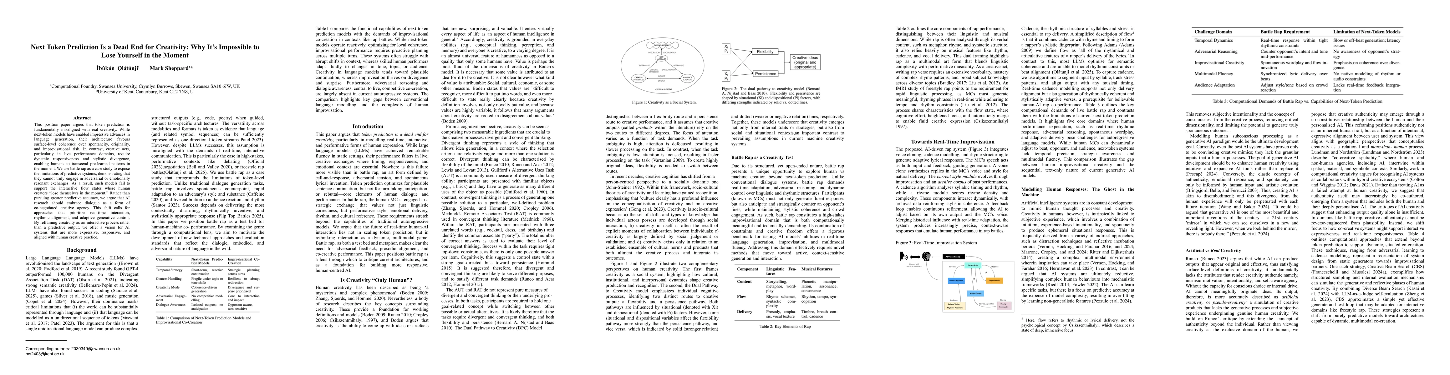 This paper argues that token prediction is fundamentally misaligned with real creativity. While next-token models have enabled impressive advances in language generation, their architecture favours surface-level coherence over spontaneity, originality, and improvisational risk. We use battle rap as a case study to expose the limitations of predictive systems, demonstrating that they cannot truly engage in adversarial or emotionally resonant exchanges. By reframing creativity as an interactive process rather than a predictive output, we offer a vision for AI systems that are more expressive, responsive, and aligned with human creative practice.