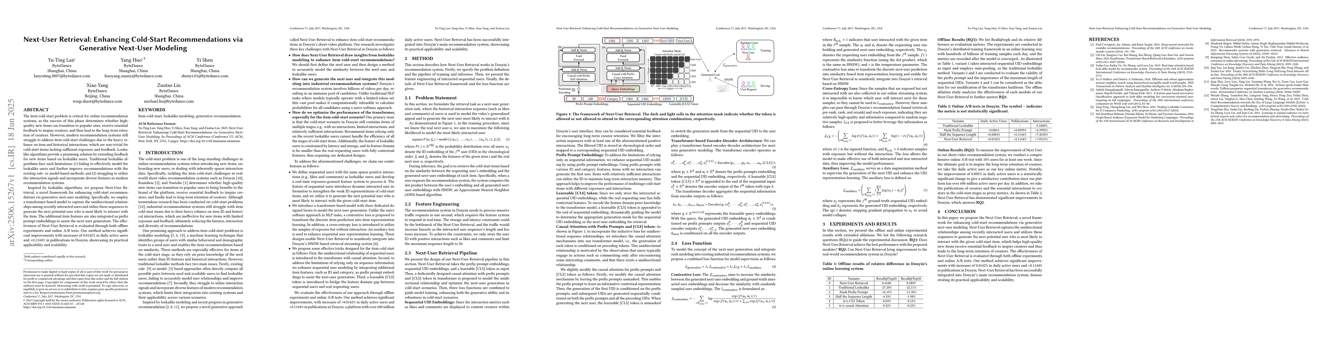 The item cold-start problem is critical for online recommendation systems, as the success of this phase determines whether high-quality new items can transition to popular ones, receive essential feedback to inspire creators, and thus lead to the long-term retention of creators. However, modern recommendation systems still struggle to address item cold-start challenges due to the heavy reliance on item and historical interactions, which are non-trivial for cold-start items lacking sufficient exposure and feedback. Lookalike algorithms provide a promising solution by extending feedback for new items based on lookalike users. Traditional lookalike algorithms face such limitations: (1) failing to effectively model the lookalike users and further improve recommendations with the existing rule- or model-based methods; and (2) struggling to utilize the interaction signals and incorporate diverse features in modern recommendation systems. Inspired by lookalike algorithms, we propose Next-User Retrieval, a novel framework for enhancing cold-start recommendations via generative next-user modeling. Specifically, we employ a transformer-based model to capture the unidirectional relationships among recently interacted users and utilize these sequences to generate the next potential user who is most likely to interact with the item. The additional item features are also integrated as prefix prompt embeddings to assist the next-user generation. The effectiveness of Next-User Retrieval is evaluated through both offline experiments and online A/B tests. Our method achieves significant improvements with increases of 0.0142% in daily active users and +0.1144% in publications in Douyin, showcasing its practical applicability and scalability.