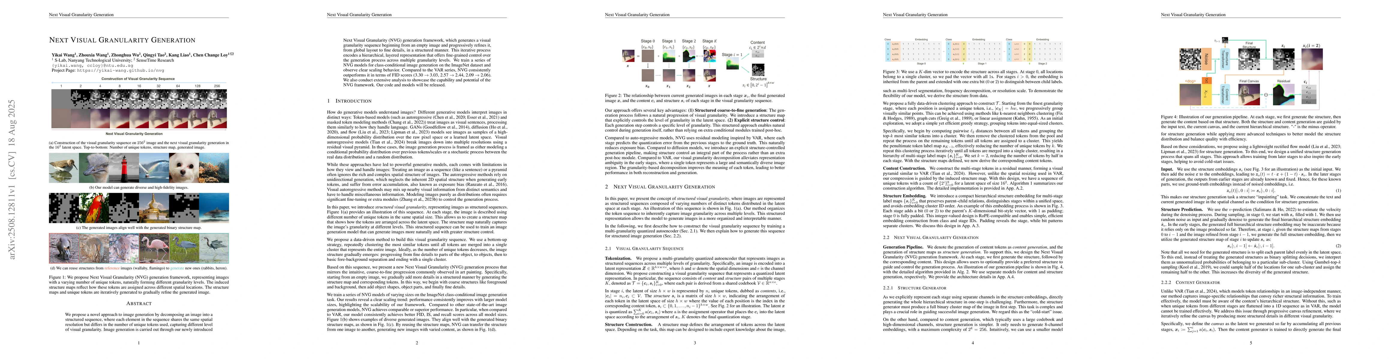 We propose a novel approach to image generation by decomposing an image into a structured sequence, where each element in the sequence shares the same spatial resolution but differs in the number of unique tokens used, capturing different level of visual granularity. Image generation is carried out through our newly introduced Next Visual Granularity (NVG) generation framework, which generates a visual granularity sequence beginning from an empty image and progressively refines it, from global layout to fine details, in a structured manner. This iterative process encodes a hierarchical, layered representation that offers fine-grained control over the generation process across multiple granularity levels. We train a series of NVG models for class-conditional image generation on the ImageNet dataset and observe clear scaling behavior. Compared to the VAR series, NVG consistently outperforms it in terms of FID scores (3.30 -> 3.03, 2.57 ->2.44, 2.09 -> 2.06). We also conduct extensive analysis to showcase the capability and potential of the NVG framework. Our code and models will be released.