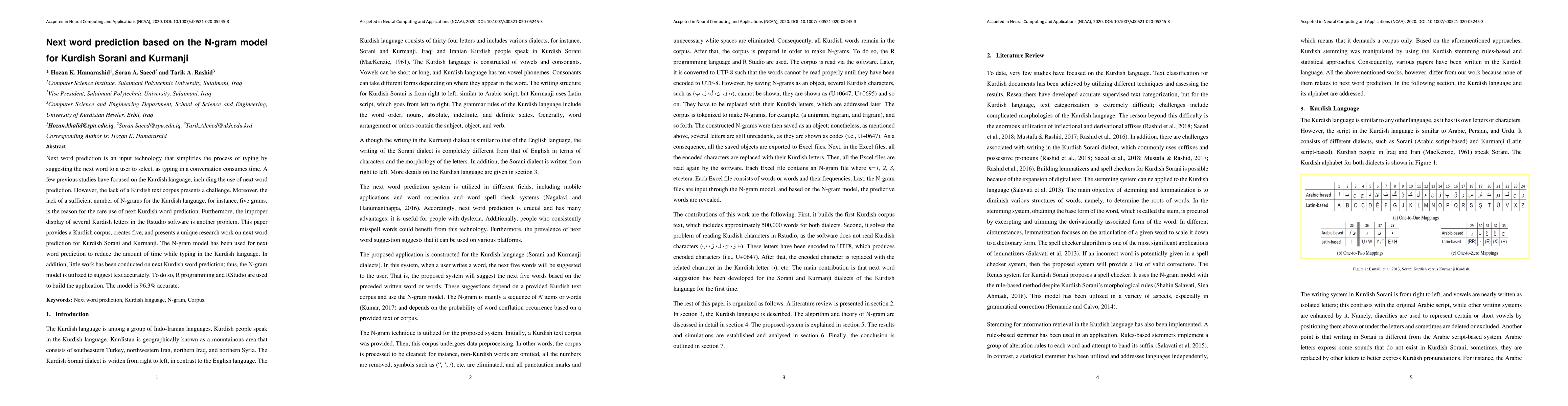 Next word prediction is an input technology that simplifies the process of typing by suggesting the next word to a user to select, as typing in a conversation consumes time. A few previous studies have focused on the Kurdish language, including the use of next word prediction. However, the lack of a Kurdish text corpus presents a challenge. Moreover, the lack of a sufficient number of N-grams for the Kurdish language, for instance, five grams, is the reason for the rare use of next Kurdish word prediction. Furthermore, the improper display of several Kurdish letters in the Rstudio software is another problem. This paper provides a Kurdish corpus, creates five, and presents a unique research work on next word prediction for Kurdish Sorani and Kurmanji. The N-gram model has been used for next word prediction to reduce the amount of time while typing in the Kurdish language. In addition, little work has been conducted on next Kurdish word prediction; thus, the N-gram model is utilized to suggest text accurately. To do so, R programming and RStudio are used to build the application. The model is 96.3% accurate.