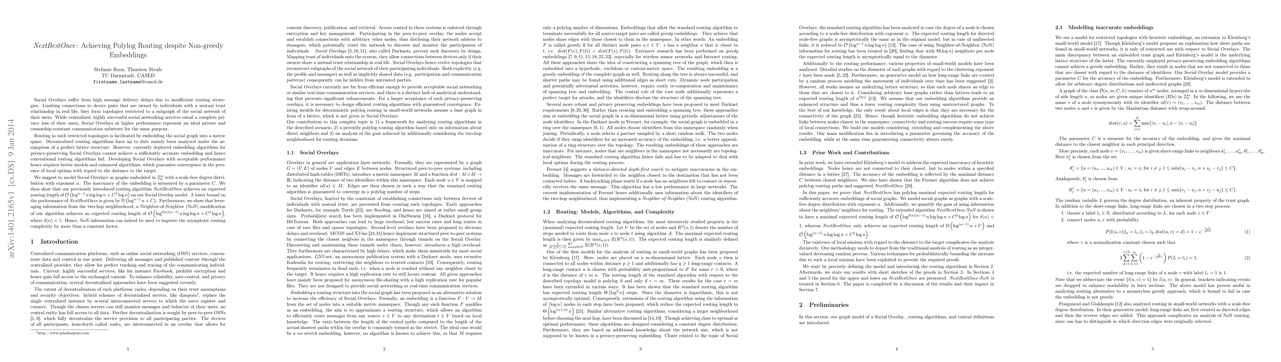 Social Overlays suffer from high message delivery delays due to insufficient routing strategies. Limiting connections to device pairs that are owned by individuals with a mutual trust relationship in real life, they form topologies restricted to a subgraph of the social network of their users. While centralized, highly successful social networking services entail a complete privacy loss of their users, Social Overlays at higher performance represent an ideal private and censorship-resistant communication substrate for the same purpose. Routing in such restricted topologies is facilitated by embedding the social graph into a metric space. Decentralized routing algorithms have up to date mainly been analyzed under the assumption of a perfect lattice structure. However, currently deployed embedding algorithms for privacy-preserving Social Overlays cannot achieve a sufficiently accurate embedding and hence conventional routing algorithms fail. Developing Social Overlays with acceptable performance hence requires better models and enhanced algorithms, which guarantee convergence in the presence of local optima with regard to the distance to the target. We suggest a model for Social Overlays that includes inaccurate embeddings and arbitrary degree distributions. We further propose NextBestOnce, a routing algorithm that can achieve polylog routing length despite local optima. We provide analytical bounds on the performance of NextBestOnce assuming a scale-free degree distribution, and furthermore show that its performance can be improved by more than a constant factor when including Neighbor-of-Neighbor information in the routing decisions.