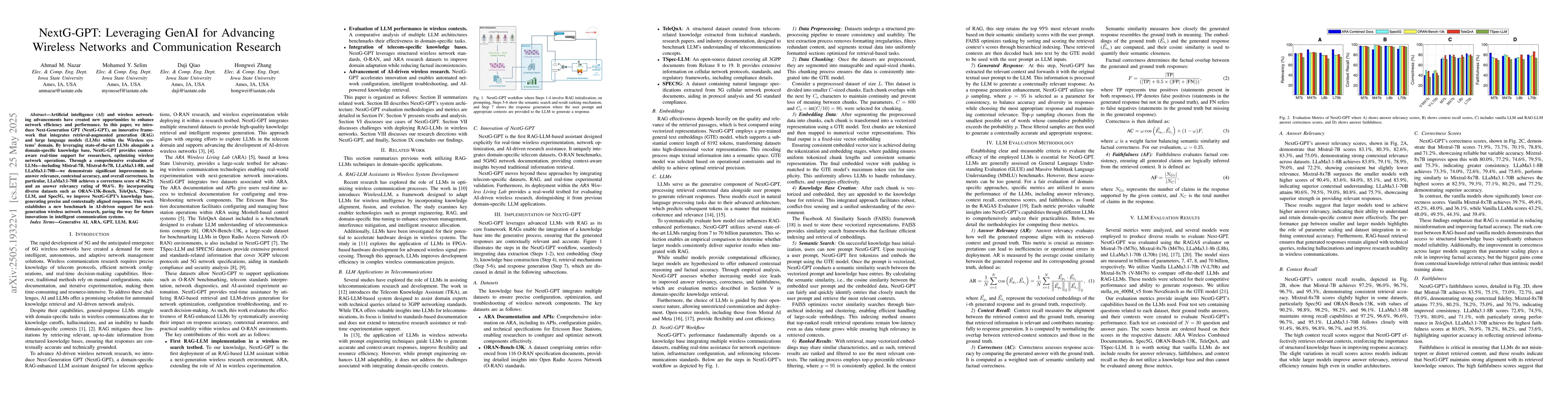 The paper introduces NextG-GPT, a framework combining retrieval-augmented generation (RAG) and large language models (LLMs) to provide context-aware real-time support for wireless network research, leveraging datasets like ORAN-13K-Bench, TeleQnA, TSpec-LLM, and Spec5G.