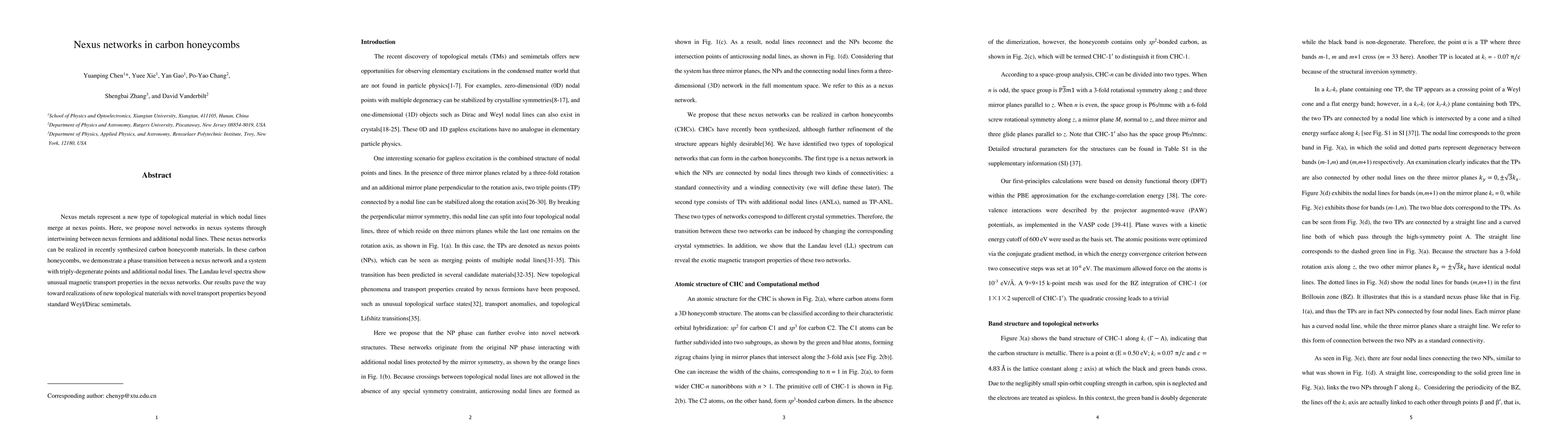 This paper proposes novel nexus networks in carbon honeycomb materials, demonstrating a phase transition and unusual magnetic transport properties due to intertwined nexus fermions and nodal lines. These findings suggest new topological materials with unique transport characteristics beyond conventional Weyl/Dirac semimetals.