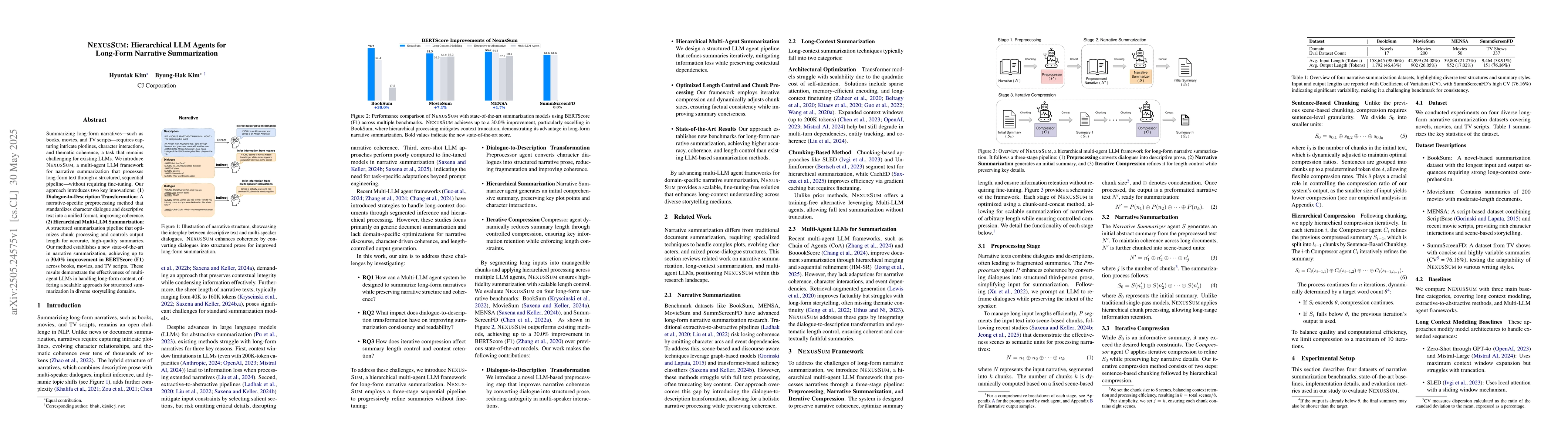 NexusSum, a multi-agent LLM framework, achieves state-of-the-art results in narrative summarization, improving BERTScore by up to 30.0% for books, movies, and TV scripts with its structured pipeline and innovations like Dialogue-to-Description Transformation.