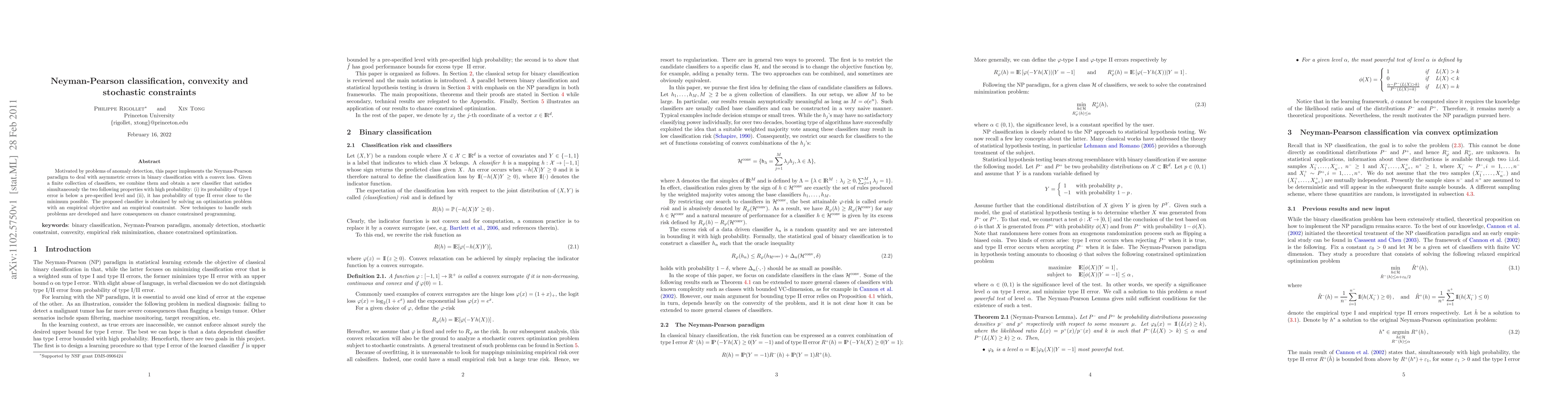 This paper combines multiple classifiers using the Neyman-Pearson paradigm to achieve optimal binary classification under asymmetric error constraints. It develops new optimization techniques to balance type I and type II errors while adhering to stochastic constraints, with implications for chance constrained programming.