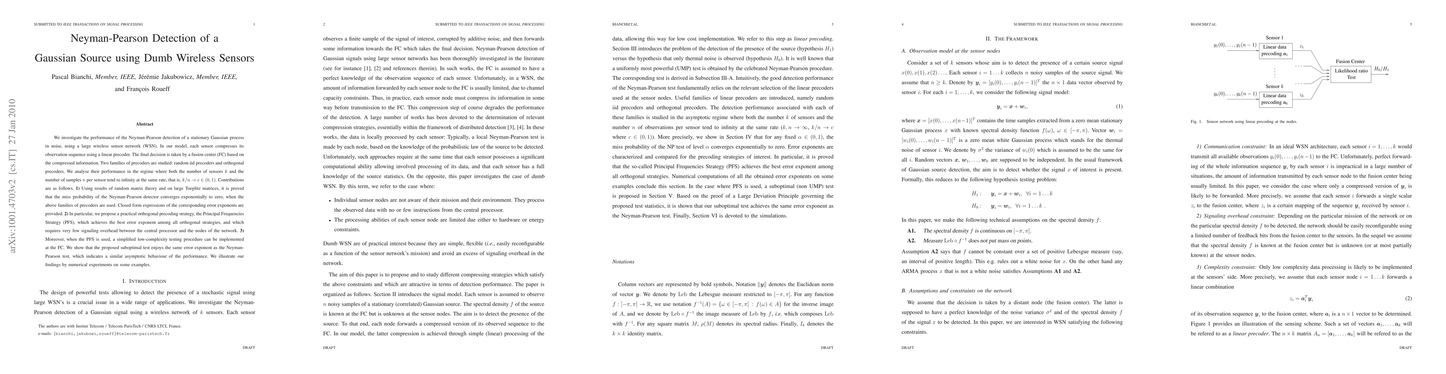 This paper investigates the Neyman-Pearson detection of a Gaussian source in a wireless sensor network, analyzing the performance of random and orthogonal precoders. It proves that the miss probability converges exponentially to zero and proposes the Principal Frequencies Strategy (PFS) for optimal orthogonal precoding with minimal overhead.