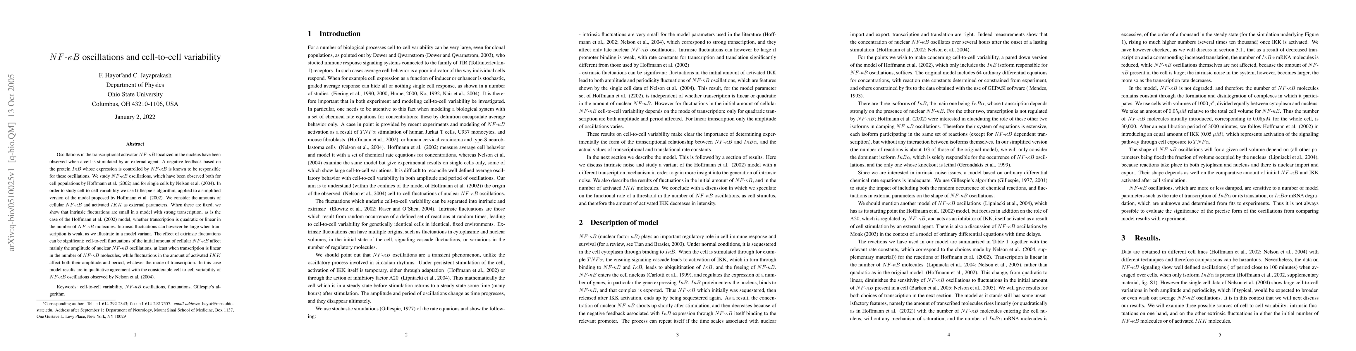 This paper investigates the oscillations of the transcription factor NF-kappa B and its variability across cells using the Gillespie algorithm, demonstrating that intrinsic fluctuations are minimal with strong transcription but significant with weak transcription. Extrinsic noise, particularly in activated kinase IKK, affects both the amplitude and period of oscillations, aligning with observed cell-to-cell variability.
