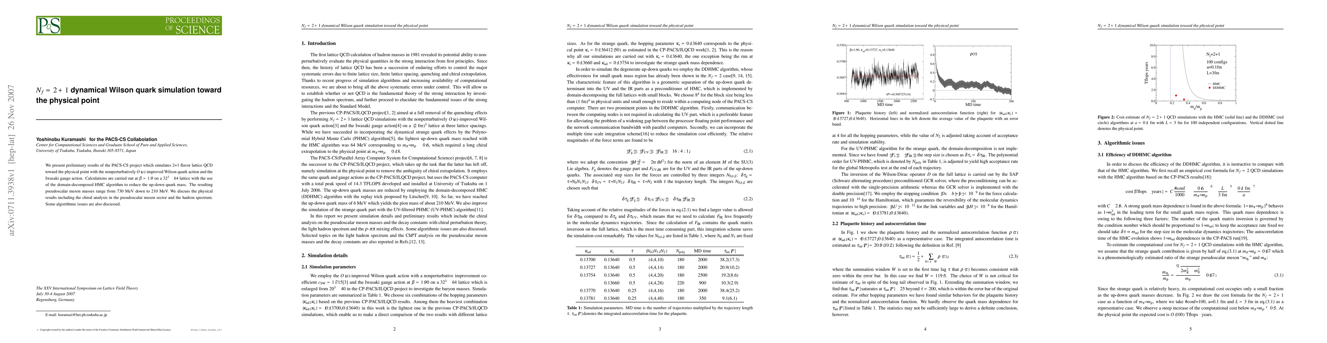 We present preliminary results of the PACS-CS project which simulates 2+1 flavor lattice QCD toward the physical point with the nonperturbatively O(a)-improved Wilson quark action and the Iwasaki gauge action. Calculations are carried out at beta=1.9 on a 32^3x64 lattice with the use of the domain-decomposed HMC algorithm to reduce the up-down quark mass. The resulting pseudoscalar meson masses range from 730 MeV down to 210 MeV. We discuss the physical results including the chiral analysis in the pseudoscalar meson sector and the hadron spectrum. Some algorithmic issues are also discussed.