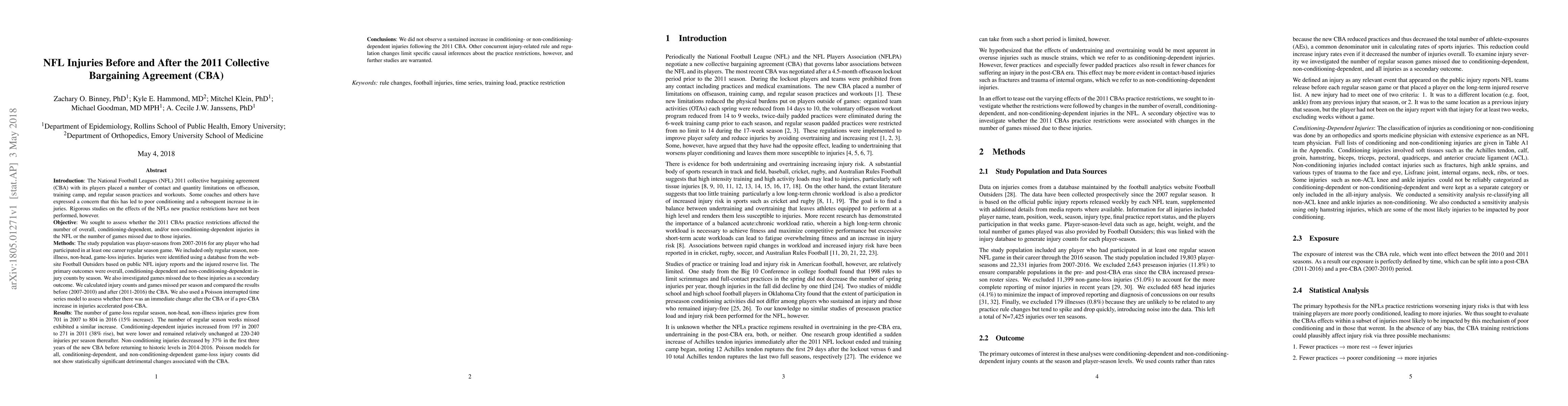 The National Football League's (NFL) 2011 collective bargaining agreement (CBA) with its players placed a number of contact and quantity limitations on practices and workouts. Some coaches and others have expressed a concern that this has led to poor conditioning and a subsequent increase in injuries. We sought to assess whether the 2011 CBA's practice restrictions affected the number of overall, conditioning-dependent, and/or non-conditioning-dependent injuries in the NFL or the number of games missed due to those injuries. The study population was player-seasons from 2007-2016. We included regular season, non-illness, non-head, game-loss injuries. Injuries were identified using a database from Football Outsiders. The primary outcomes were overall, conditioning-dependent and non-conditioning-dependent injury counts by season. We examined time trends in injury counts before (2007-2010) and after (2011-2016) the CBA using a Poisson interrupted time series model. The number of game-loss regular season, non-head, non-illness injuries grew from 701 in 2007 to 804 in 2016 (15% increase). The number of regular season weeks missed exhibited a similar increase. Conditioning-dependent injuries increased from 197 in 2007 to 271 in 2011 (38% rise), but were lower and remained relatively unchanged at 220-240 injuries per season thereafter. Non-conditioning injuries decreased by 37% in the first three years of the new CBA before returning to historic levels in 2014-2016. Poisson models for all, conditioning-dependent, and non-conditioning-dependent game-loss injury counts did not show statistically significant or meaningful detrimental changes associated with the CBA. We did not observe an increase in injuries following the 2011 CBA. Other concurrent injury-related rule and regulation changes limit specific causal inferences about the practice restrictions, however.