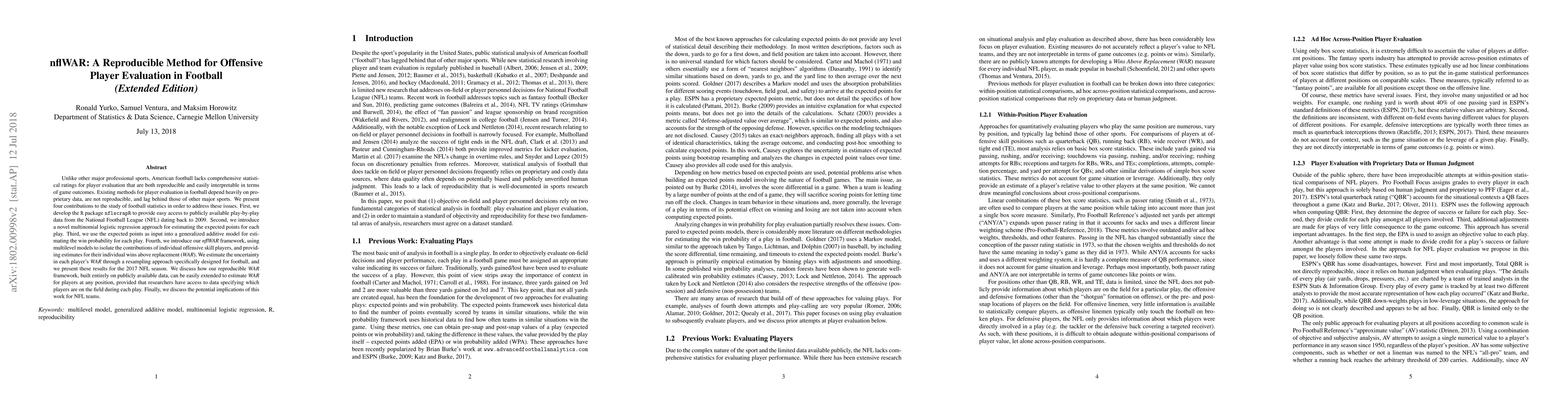 The paper presents nflWAR, a reproducible method for evaluating offensive player contributions in American football, using publicly available play-by-play data. The authors introduce nflscrapR for data access, a multinomial logistic regression for expected points, and a generalized additive model for win probability, culminating in a framework to estimate individual player wins above replacement (WAR) for the 2017 NFL season.